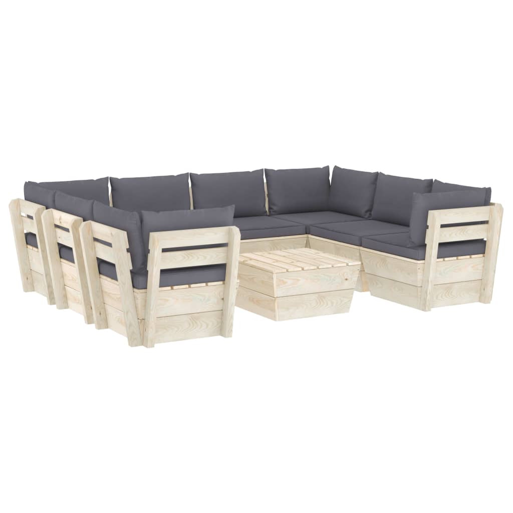 Diese 9-teilige Garten-Sofagarnitur aus Paletten mit Kissen ist eine ausgezeichnete Wahl, um sich zu entspannen und das Wetter zu genießen, ein Nickerchen zu machen oder mit Ihrer Familie oder Freunden zu plaudern. Mit seinem zeitlosen Palettendesign verleiht dieses Lounge-Set aus Holz Ihrer Terrasse, Ihrem Garten oder Ihrem Wohnzimmer einen Hauch von rustikalem Charme. Das Garten-Lounge-Set besteht aus imprägniertem Fichtenholz und ist somit langlebig und stabil. Diese Terrassen-Sofagarnitur verfügt über eine solide Konstruktion und ist wartungsarm. Mit seiner robusten Tischplatte bietet der Tisch den idealen Platz, um Snacks und Getränke griffbereit zu halten. Dank der Bezüge aus 100 % Polyester und der dicken Polsterung fühlen sich die Palettenauflagen weich an und bieten höchsten Komfort. Darüber hinaus ermöglicht Ihnen der modulare Aufbau, das Set in einer beliebigen Anordnung je nach Ihrem Geschmack aufzustellen. Bitte beachten Sie, dass Holz ein Naturprodukt ist und daher Unvollkommenheiten aufweisen kann.