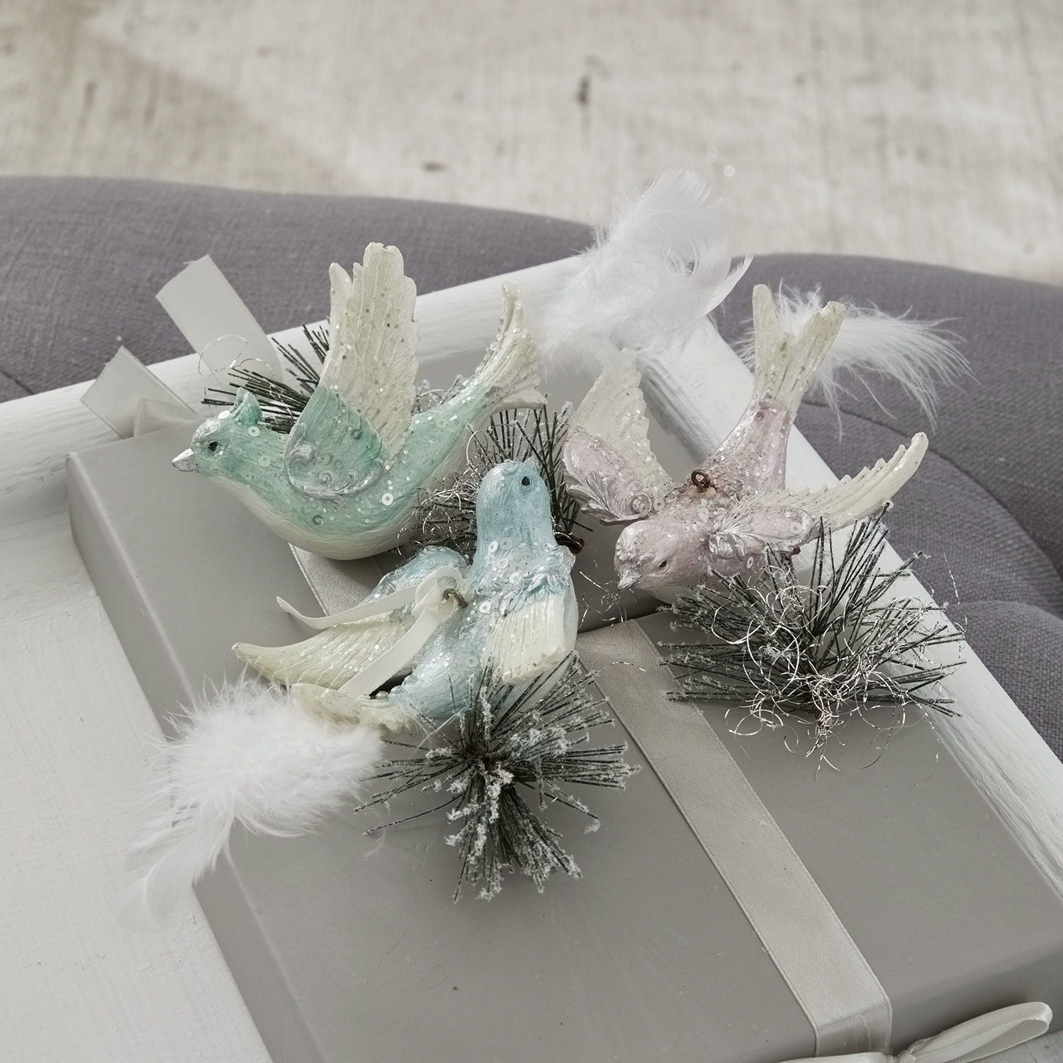 Verzaubern Sie mit den drei wunderschön funkelnden Vögelchen Ihr Zuhause. Die kleinen Schmuckstücke aus Polyresin sind sehr fein von Hand bemalt und mit unterschiedlichem Glitzer bestäubt, sodass sie glamourös schimmern. Jedes Vögelchen ist mit einer Hühnerfeder verziert. Feine Pastelltöne sorgen für eine bezaubernde Optik. Die sehr leichte Anmutung und drei Farben im Set machen die Vögel zu einem gekonnten Highlight. Ob am Weihnachtsbaum, am Osterzweig oder das ganze Jahr hindurch an einer Schnur am Fenster, wer seinen Wohnraum romantisch schmücken möchte, trifft hiermit die perfekte Wahl. Die Vögel lassen sich mit vielerlei Dekoration harmonisch kombinieren und sind ein ganz besonderer Akzent. Winterzweige oder Wandhaken lassen sich damit ebenso gut bestücken. Die freundlichen Tierchen machen einfach gute Laune .