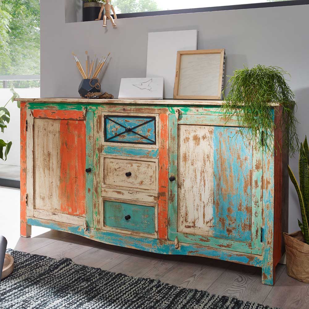 – Sideboard Bunt – Wohnzimmerschrank Recyclingholz – Kommode Shabby Chic – Sidebord Breite: 150 – Küchenkommode Höhe: 85 – Kommode holz Tiefe: 38 – Kommode massivholz Mit drei Schubladen und mit Holzauszug – Wohnzimmer schrank Ausergewöhnliches Design – Wohnzimmer kommode Schrank-Tür: mit Drehtüren – Kommode massiv 2-türig, Innenaufteilung: mit Einlegeböden – Kommode echtholz Ohne Beleuchtung – Große kommode Fertig montierte Anlieferung (eventuell müssen noch Kleinteile angebracht werden) – Echtholz kommode 4-Fuß Gestell aus Massivholz – Kommode vollholz Massivholz Oberfläche und Lackiert – Esszimmer kommode Metallgriffen – Massivholzkommode Rechteckige Form – Wohnzimmerkommode Massivholz Tür – Esszimmerkommode Griff Form: KnopfgriffInformationen zur Lieferung:Die Zustellung dieses Produktes erfolgt per Spedition. Sie werden vor der Auslieferung durch die ausliefernde Spedition kontaktiert.Terminvereinbarung: Sie werden frühzeitig (ein paar Tage im Voraus) durch die ausliefernde Spedition kontaktiert und Ihnen der Auslieferzeitpunkt mitgeteilt. Die Kontaktaufnahme erfolgt per Telefon. Bei telefonischer Nichterreichbarkeit werden Sie per Postkarte über das Auslieferdatum informiert.Die Lieferung erfolgt aus Kostengründen Frei Bordsteinkante (bis zur ersten verschlossenen Tür). Für den weiteren Transport der Ware sind Sie eigenverantwortlich.Die Auslieferung erfolgt von Montags bis Freitags. Eine Zustellung an Sonn- und Feiertagen ist nicht möglich.