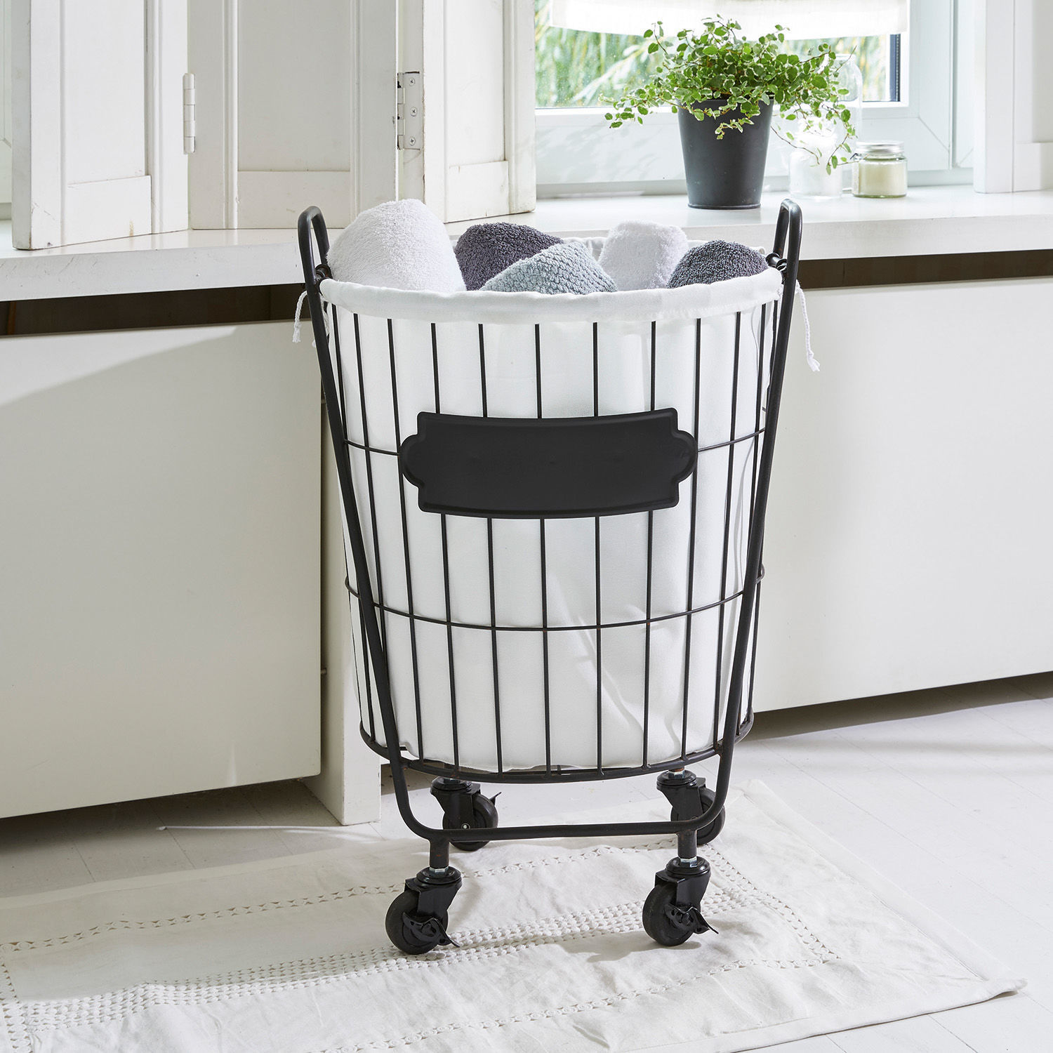 Accessoires aus Schmiedeeisen sind typisch für den rustikalen Landhaus-Stil, der sich gerne auch im Bad stimmig fortsetzt. Doch so harmonisch sich der dunkle Eisenkorb in ein traditionelles Landhaus-Bad einfügt und so strahlend frisch der weiße Wäschesack dazu wirkt, ist er doch für eine Überraschung gut: Er war nämlich einmal eine PET-Flasche. Oder besser mehrere. Seit einiger Zeit werden aus diesen Plastikflaschen neue Polyesterfasern gefertigt, die anschließend zu Shirts, Jacken und anderen Textilien verarbeitet werden. Der Vorteil: Der Wäschesack ist leicht und doch sehr stabil und kann sogar bei 30° gewaschen werden. Gleichzeitig bedeutet der vermehrte Einsatz von wiederaufbereiteten PET-Flaschen in unserem Alltag, dass weniger neue Ressourcen dafür verbraucht werden und weniger Abfall produziert wird. Eine umweltfreundliche und nachhaltige Verhaltensweise, wie sie nicht besser zum naturnahen Landhaus-Stil passen könnte. Doch bei aller Konzentration auf Design und Ökologie wurde auch die praktische Seite nicht vergessen. Deshalb ist der Wäschekorb mit vier Rollen ausgestattet, mit denen er ganz leicht zum Beispiel aus dem Bad ins Schlafzimmer und zurück transportiert werden kann. Eben genau dahin, wo er gerade gebraucht wird.