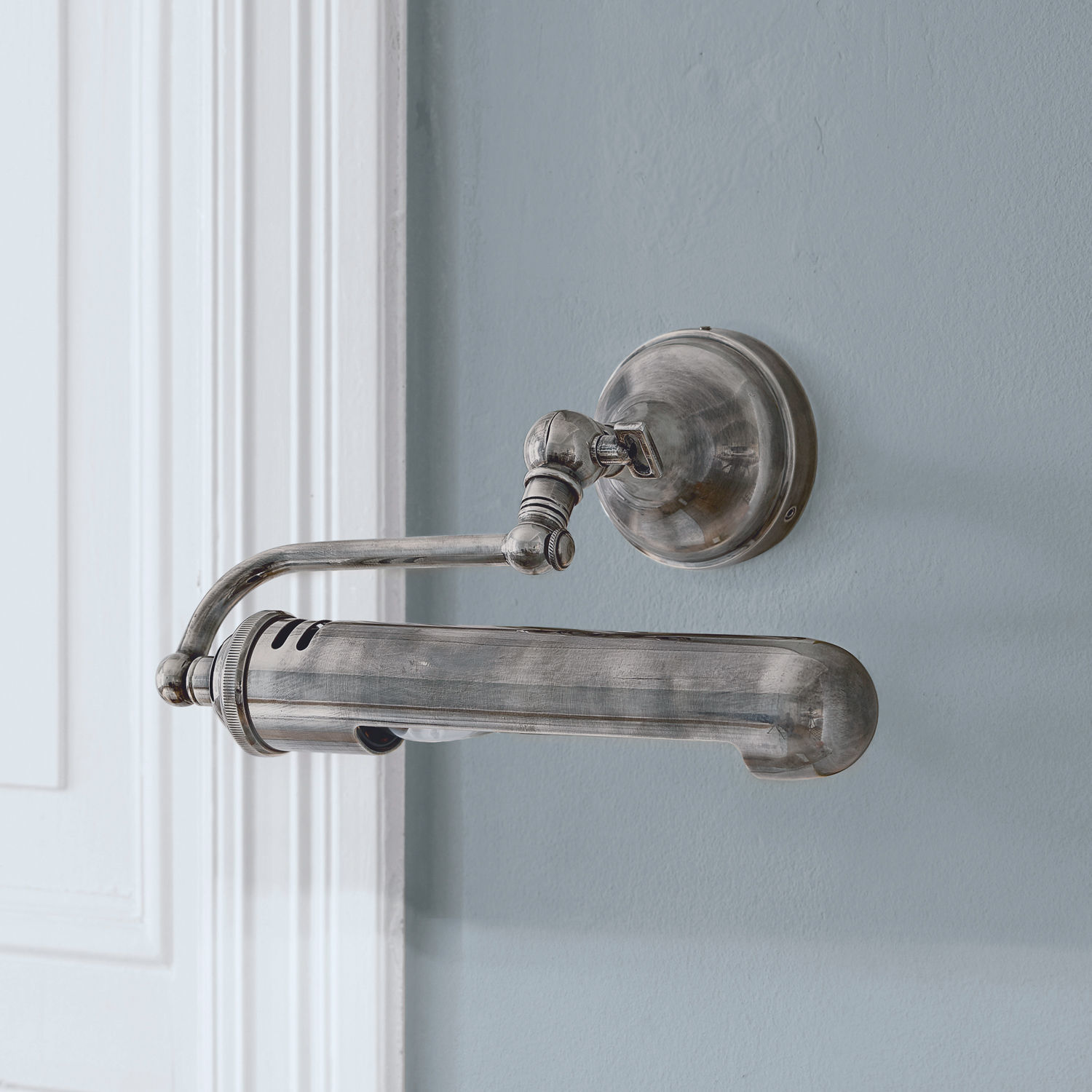 Kleine Lampe, großer Retro-Charme: Aus reinem Messing glänzt diese bezaubernde Lampe an jeder Wand. Die stabförmige Lampe erinnert mit ihrer eleganten Form an die klassischen Bilderleuchten, die Kunstdrucke gekonnt erhellen. Zur Einstellung der Wandlampe kann – je nach Wunsch – das Gelenk verstellt beziehungsweise gekippt werden. Für eine stimmungsvolle Beleuchtung ist die antik veredelte Lampe ein besonderer Blickfang. Und im 2er-Ensemble verstärkt sich dieser herrliche Eindruck. Die silberfarbene Wandlampe aus Messing bringt nostalgisches Flair in den Landhaus-Chic.