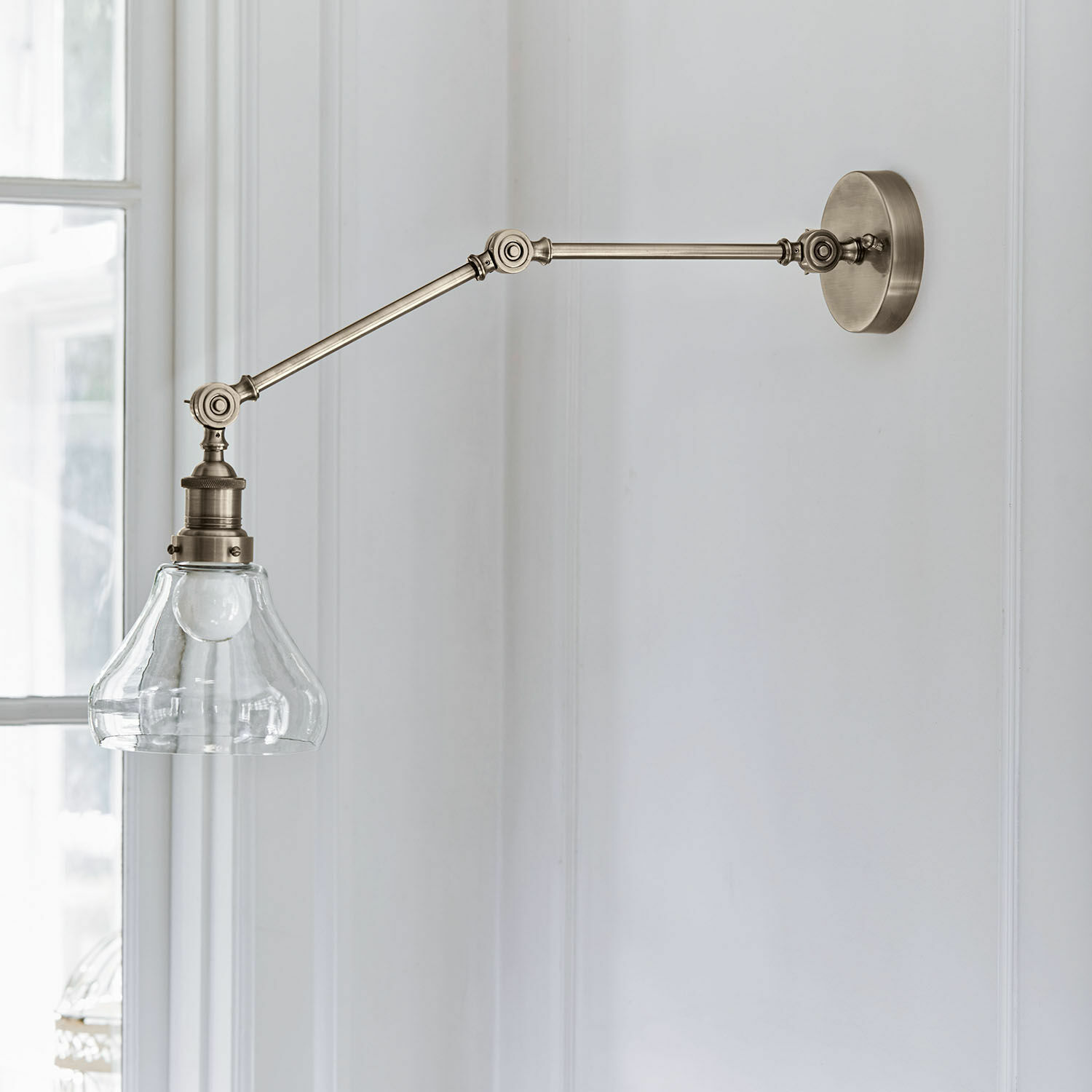 Ein leuchtendes Highlight: Diese ästhetische Wandlampe mit mundgeblasenem Schirm kokettiert mit dem Industrial-Look und besticht durch ihre stilvolle Optik, ihr hochwertiges Material und natürlich auch durch ihre eigentliche Funktion als Lichtspender. Sie kombiniert Glas mit langlebigem Eisen, das mit einem schicken matten Finish besonders reizvoll veredelt ist. Ob im Hobbyraum, im Arbeitszimmer oder als Leselampe über Ihrem Lieblingssofa: Für Helligkeit bei Arbeit oder Freizeitbeschäftigung ist gesorgt. Auch wenn es eine gezielte Beleuchtung braucht – denn der Neigungswinkel des Schmuckstücks ist in der Horizontalen durch die Gelenke individuell einstellbar, sodass Sie sogar gezielte Spotlights setzen können, um bestimmte Dekoobjekte in Szene zu setzen.
