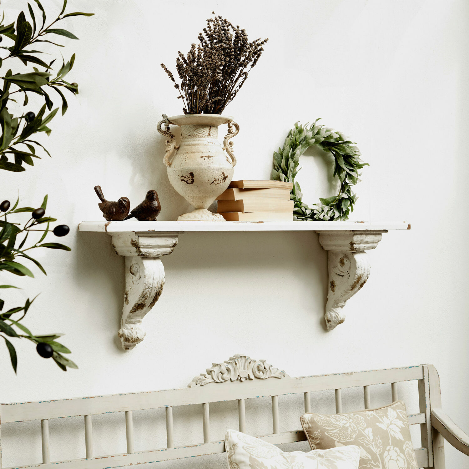 Bei dieser charmanten Wandkonsole ist es Liebe auf den ersten Blick, vor allem, wenn Sie Fan hochwertiger Shabby Chic-Accessoires sind. Sie wirkt wie ein wertvolles Museumsrelikt aus längst vergangenen Tagen und präsentiert wunderschön gearbeitete Details. Das beginnt schon bei den charmanten Finessen der aus Kunststein geformten Halterungen. Sie bilden eine tolle Bühne für das darauf liegende Holzbrett. Die Halterungen sind mit demselben Antik-Finish behandelt wie die großzügig dimensionierte Ablage. Das Finish wird in mehreren Schichten aufgetragen und sorgfältig bearbeitet, um für authentische Alterserscheinungen zu sorgen. Das edle Vintage-Design fügt sich nahtlos in klassisch eingerichtete Wohnkonzepte ein und bildet einen hervorragenden Kontrast zu zeitgenössischen Interieurs.