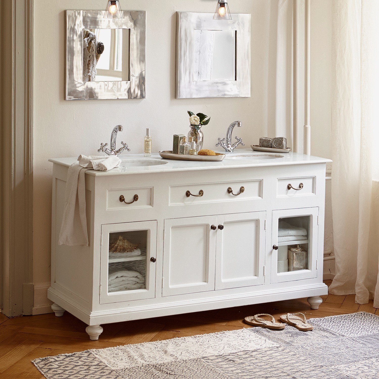 Neuer Look für Ihr Bad gesucht? Massives Mangoholz mit dezentem Antik-Finish und eine hochwertige Marmorplatte versprechen diesen Doppelwaschtisch zum Highlight in Ihrem Badezimmer werden zu lassen. Der elegante Landhaus-Stil wird dabei noch durch die Zierblende in Schubkasten-Optik betont. Hinter den vier Türen des Schrankes bietet sich genug Stauraum für Kosmetik, Handtücher, Waschlappen und Co. Ein echtes Lieblingsmöbelstück!