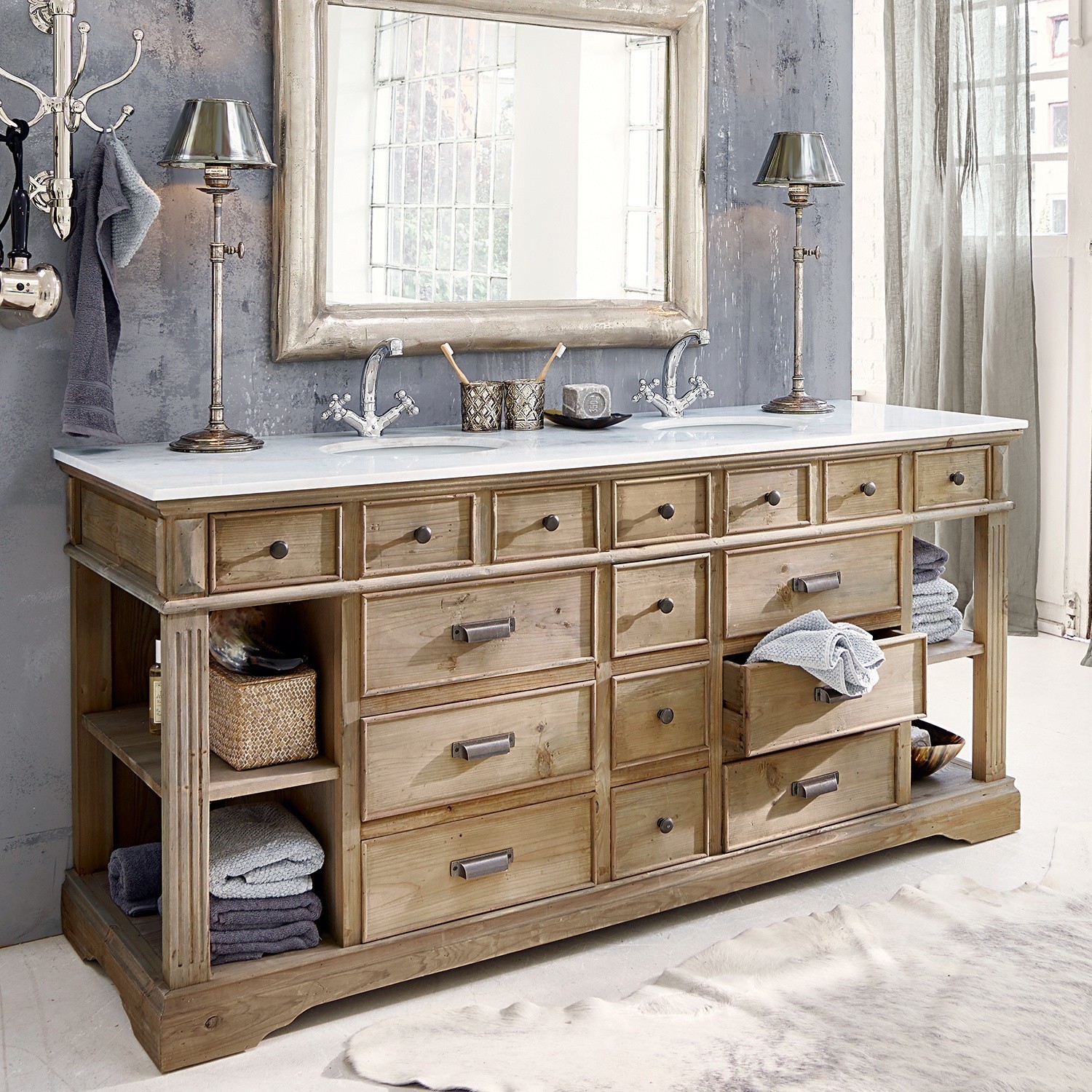 Großzügiger und luxuriöser Doppelwaschtisch für zwei Personen. Aus wiederaufbereitetem Tannenholz und einem natürlich wirkenden Antik-Finish. Elegante helle […]