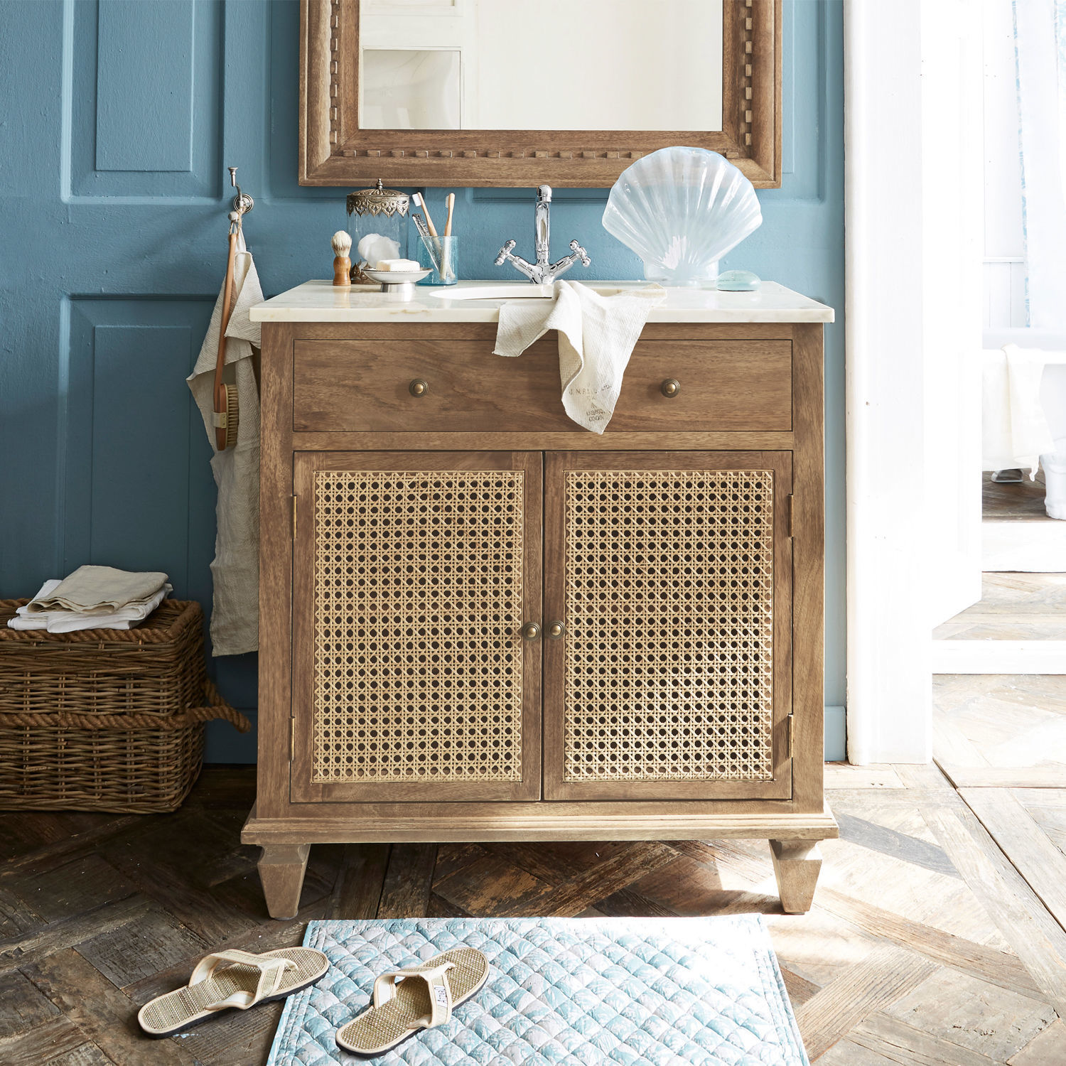 Verwandeln Sie Ihr Bad in eine noble Wellness-Oase – mit diesem Waschtisch ist das ein Kinderspiel. Der Korpus ist sorgfältig aus massivem Mangoholz gefertigt und verbreitet das luxuriöse Flair vergangener Zeiten, als auch die Möbel für das Badezimmer nicht aus Kunststoff, sondern aus edlen Hölzern gefertigt wurden. In traditioneller Handwerksmanier, mit großer Sorgfalt und viel Liebe zum Detail, wie dieser Waschtisch aufs Schönste beweist. Als erlesener Kombinationspartner zu dem ausdrucksstarken Holz mit natüricher Maserung wurde heller Marmor gewählt, einer der edelsten Natursteine, der hier elegant das ebenfalls helle Porzellanwaschbecken umrahmt. Unter den beiden angedeuteten Schubladen lockert luftiges Wiener Geflecht den massiven Auftritt des Waschtisches auf und demonstriert hier überzeugend, dass es mehr kann als nur auf Stühlen zu sitzen. Was Sie hinter den Türen verstauen, ist ganz Ihnen überlassen: Der Schrankboden und ein fester Regalboden stehen bereit für Handtücher, Cremes, Shampoo und was immer Sie sonst dort unterbringen möchten. Klassisch gearbeitete Füße, der profilierte Kranz und die Knöpfe aus Eisen komplettieren den antiken Look. Doch so charmant der Waschtisch die noble Atmosphäre herrschaftlicher Badezimmer heraufbeschwört, ist er doch ein Kind der Moderne, denn natürlich sind bereits die Ausschnitte für die Wasseranschlüsse vorbereitet.
