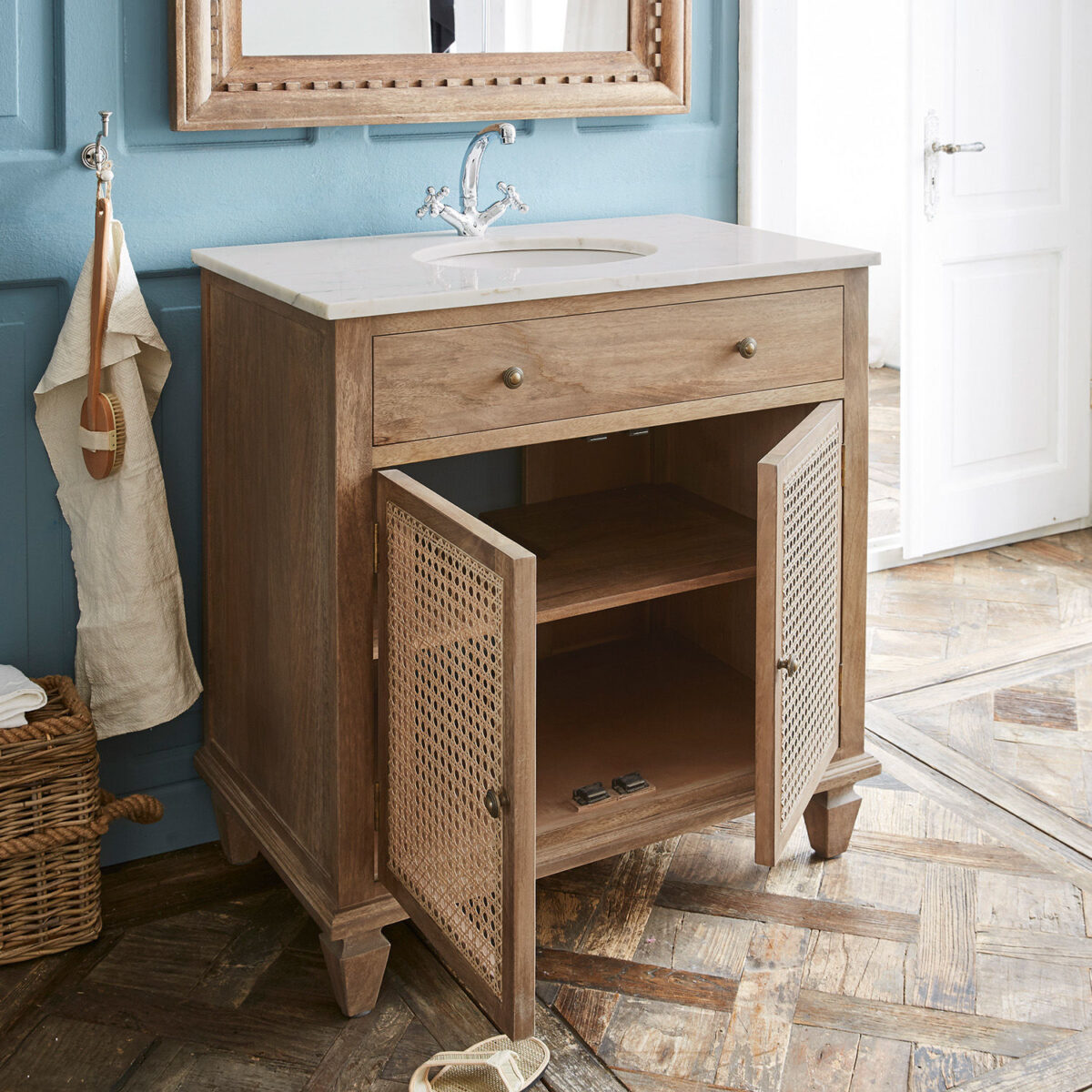 Verwandeln Sie Ihr Bad in eine noble Wellness-Oase – mit diesem Waschtisch ist das ein Kinderspiel. Der Korpus ist sorgfältig aus massivem Mangoholz gefertigt und verbreitet das luxuriöse Flair vergangener Zeiten, als auch die Möbel für das Badezimmer nicht aus Kunststoff, sondern aus edlen Hölzern gefertigt wurden. In traditioneller Handwerksmanier, mit großer Sorgfalt und viel Liebe zum Detail, wie dieser Waschtisch aufs Schönste beweist. Als erlesener Kombinationspartner zu dem ausdrucksstarken Holz mit natüricher Maserung wurde heller Marmor gewählt, einer der edelsten Natursteine, der hier elegant das ebenfalls helle Porzellanwaschbecken umrahmt. Unter den beiden angedeuteten Schubladen lockert luftiges Wiener Geflecht den massiven Auftritt des Waschtisches auf und demonstriert hier überzeugend, dass es mehr kann als nur auf Stühlen zu sitzen. Was Sie hinter den Türen verstauen, ist ganz Ihnen überlassen: Der Schrankboden und ein fester Regalboden stehen bereit für Handtücher, Cremes, Shampoo und was immer Sie sonst dort unterbringen möchten. Klassisch gearbeitete Füße, der profilierte Kranz und die Knöpfe aus Eisen komplettieren den antiken Look. Doch so charmant der Waschtisch die noble Atmosphäre herrschaftlicher Badezimmer heraufbeschwört, ist er doch ein Kind der Moderne, denn natürlich sind bereits die Ausschnitte für die Wasseranschlüsse vorbereitet.