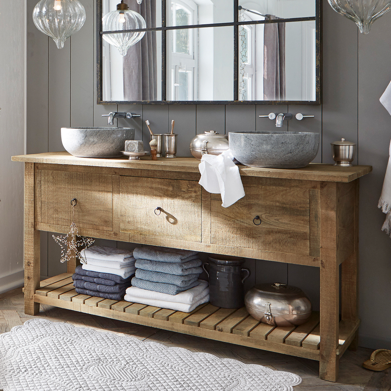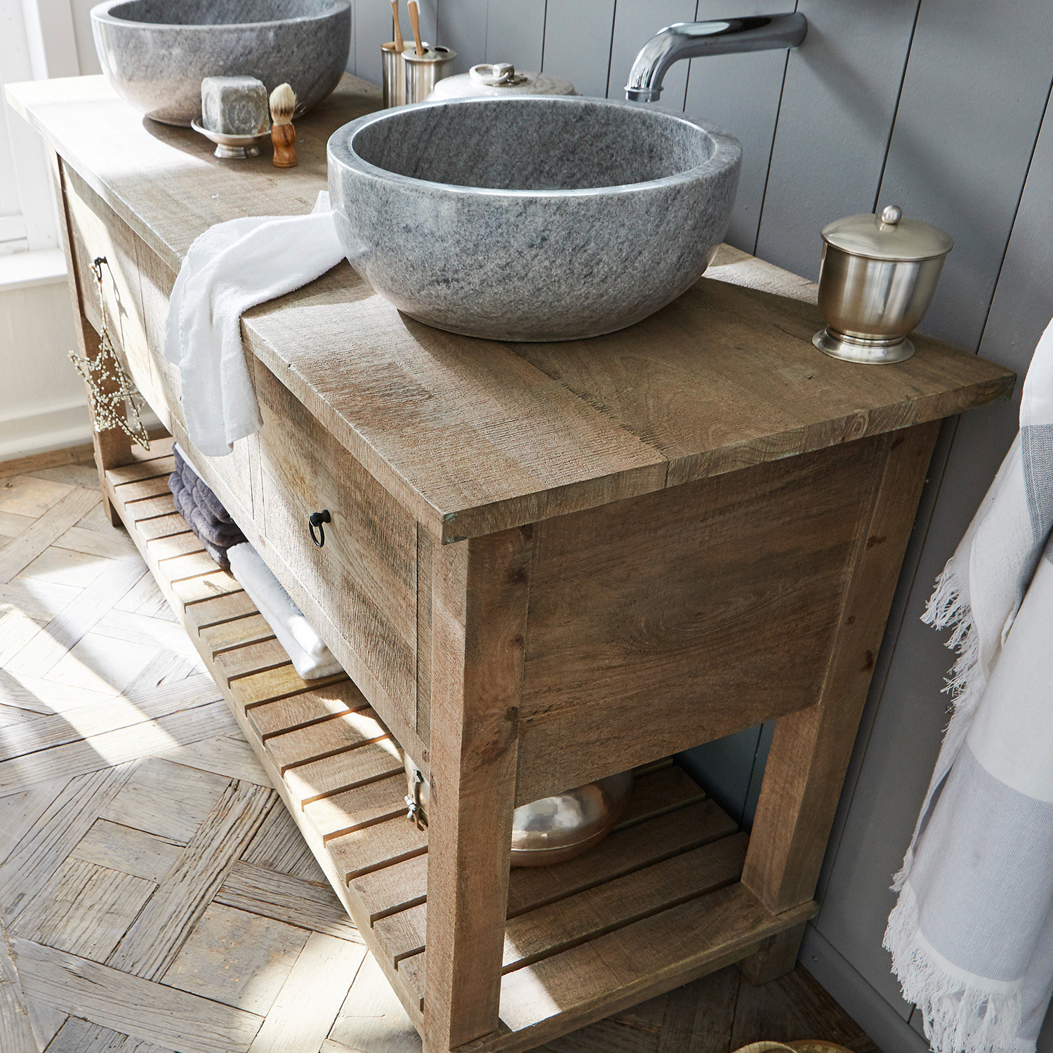 Naturbelassenes Mangoholz. Mit zwei edlen Naturstein-Becken mit grob bearbeiteter Außenseite. Großzügige Ablagefläche im unteren Bereich. Eine Schublade im oberen […]