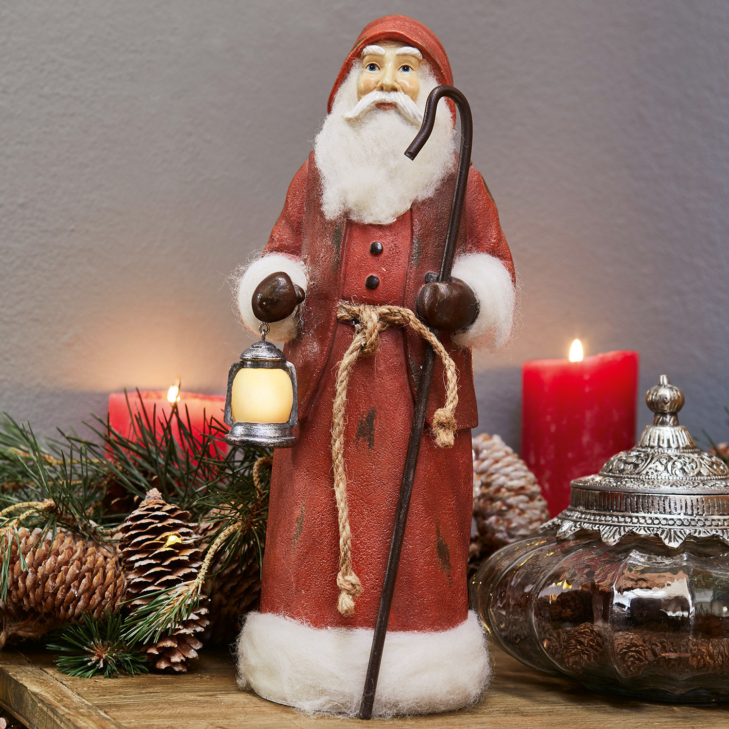 Ho ho ho! Der Weihnachtsmann persönlich kommt mit dieser stimmungsvollen Figur in Ihr Zuhause. Er besteht aus Polyresin mit hübschem Antik-Finish. Alles an ihm ist detailreich gestaltet, bis hin zu seiner Laterne, die tatsächlich leuchtet. Möglich machen das ein LED-Licht und eine Knopfzelle (nicht im Lieferumfang enthalten). So holen Sie Weihnachtsflair pur in Ihr Zuhause. Auch an dunklen Winterabenden leuchtet der freundliche Santa den Weg – vielleicht ja im Fenster platziert?