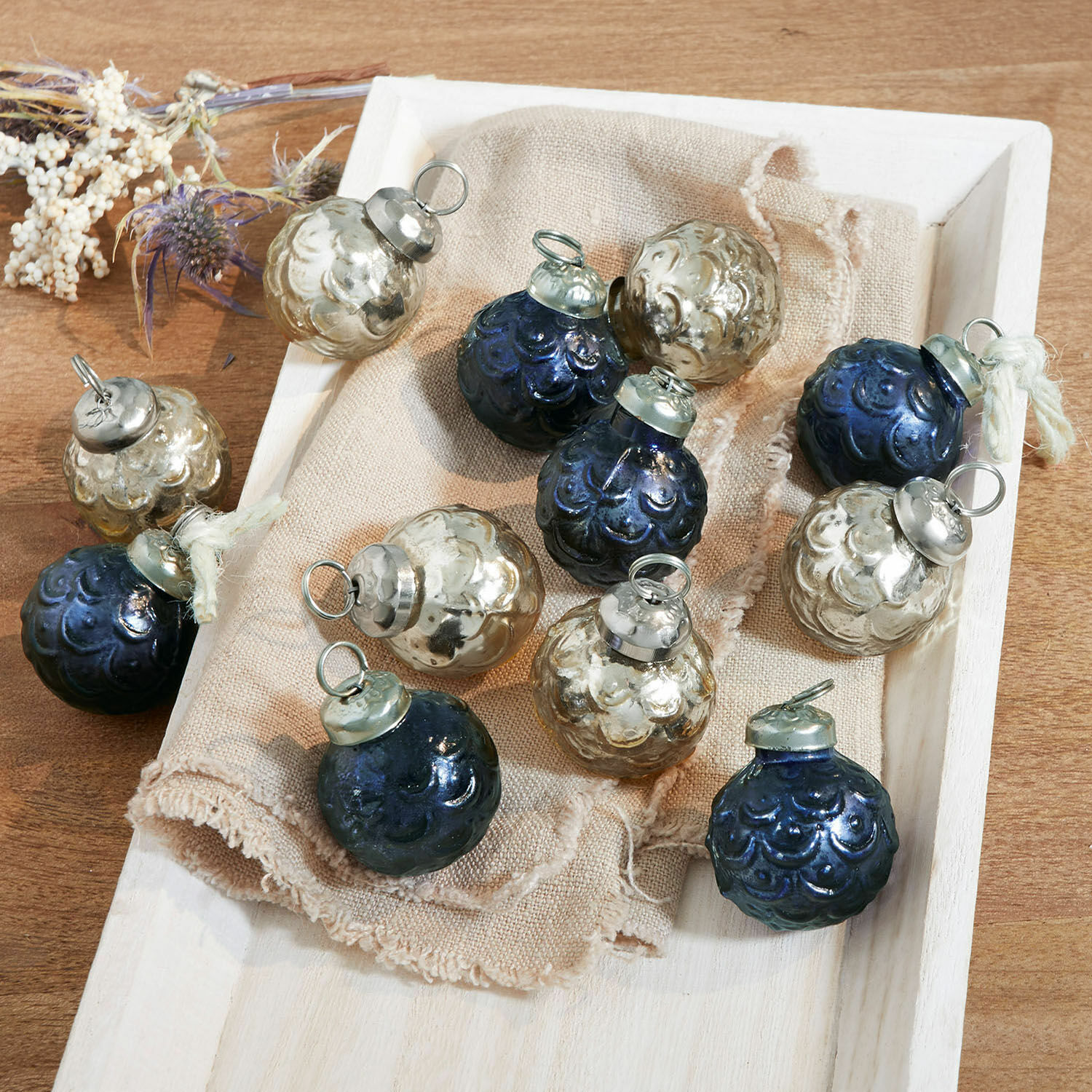 Das nostalgische und bereits perfekt kombinierte Set beinhaltet zwölf hübsche, kleine Kugeln in zwei stilvollen Tönen. Eine charmante Allover-Prägung ziert die Schätze aus Glas. Sie schmücken stilvoll Ihre Weihnachtstanne oder auch Winterzweige. Auch auf einem Tablett arrangiert oder kreativ am Adventskranz befestigt versprühen sie ihren Charme. Ebenso lassen sich mit diesen kleinen Schmuckstücken auch Geschenke verzieren. Zu weiterem Baumschmuck lassen die zarten Kugeln sich bestens kombinieren, sodass eine individuelle Optik entsteht. Freuen Sie sich alle Jahre wieder auf das stilsichere Set, mit dem die Weihnachtszeit noch schöner und festlicher wird. Zünden Sie nur noch die Kerzen an, trinken Sie eine heiße Schokolade und schwelgen Sie im Zauber der Weihnachtszeit.