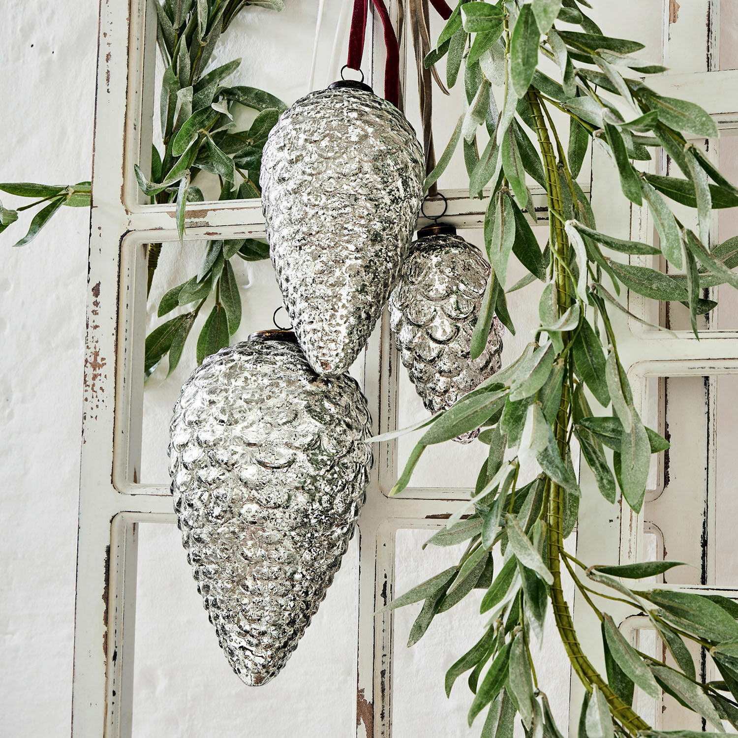 Weihnachtsschmuck auf nostalgische und elegante Weise neu interpretiert – freuen Sie sich auf drei große und sehr schöne Anhänger im Zapfen-Design. Hiermit kommt der schimmernde Winterwald in Ihr Zuhause. Die luxuriösen Schmuckstücke bestehen aus feinem Glas mit Bauernsilber-Finish und kommen in drei Größen zu Ihnen. Sie zieren sehr charmant den Weihnachtsbaum, stabile Zweige oder auch Wandhaken – ein gekonnter Akzent zum Shabby-Chic. So wird die Festdekoration ausgesprochen ästhetisch und zeitlos, und auch weitere Baumkugeln lassen sich harmonisch mit den hübschen und stattlichen Zapfen kombinieren. Wer Weihnachten mit elegantem Vintage-Flair feiern möchte, wird dieses klassische Trio lieben.