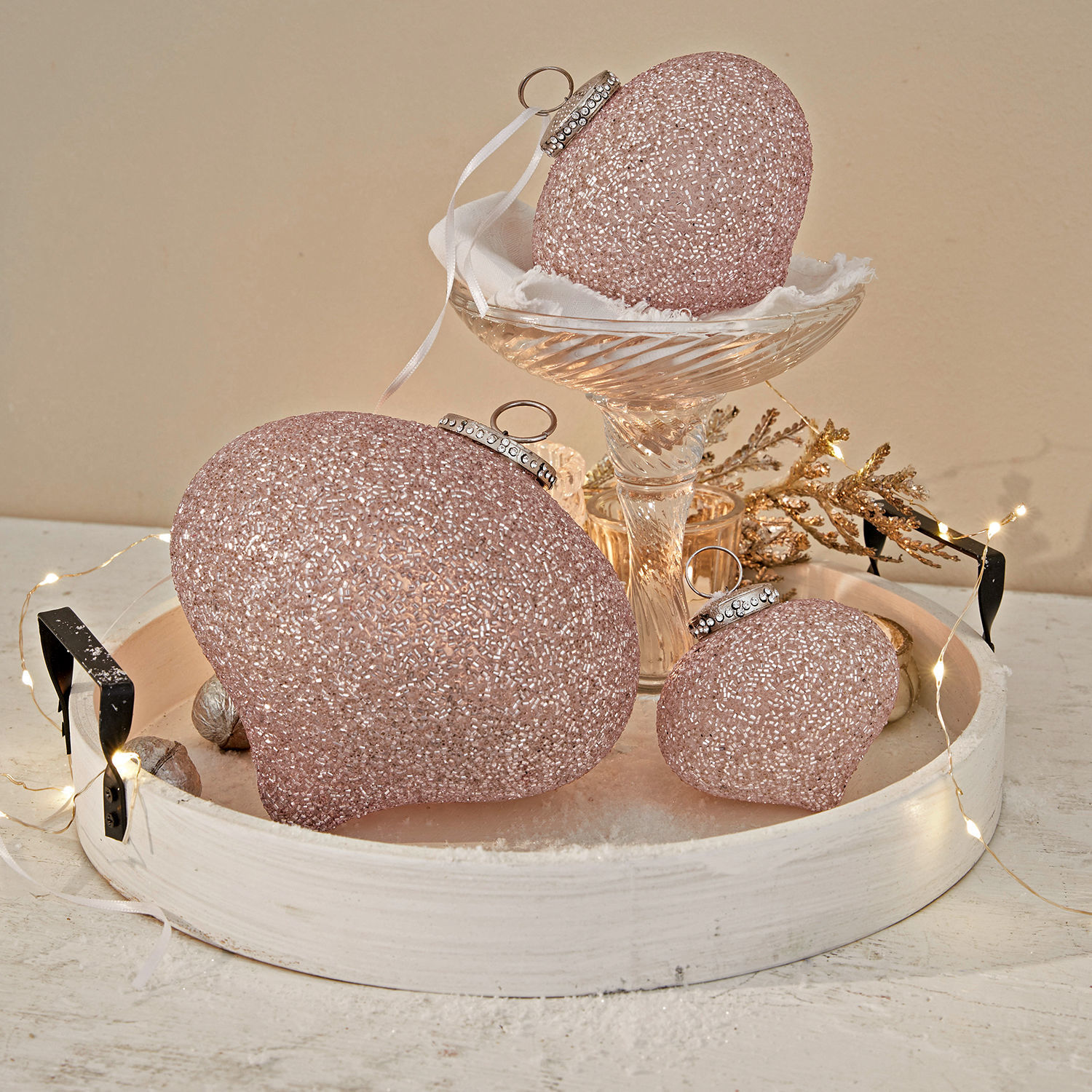 Weihnachten im Romantik-Look – freuen Sie sich auf ein reizendes Set aus feinem Glas mit süßem Zucker-Finish. Die zarten Nuancen sorgen für eine Prise Romantik und sind eine schöne Abwechslung zu sonstigem Baumschmuck. Die Kugeln in drei Größen haben eine attraktive und harmonische Zwiebelform. Sie sind perfekt aufeinander abgestimmt, sodass es ganz leicht wird, ein Deko-Konzept zu finden. Funkelnde Strassstein-Details an den Kappen sorgen für einen Hauch Glamour und reflektieren hübsch das Licht. Zieren Sie hiermit die Tanne oder Winterzweige und machen Sie sich die festliche Zeit besonders gemütlich. Romantiker könnten sogar das ganze Jahr über kreative Arrangements mit den drei schimmernden Schmuckstückchen kreieren.