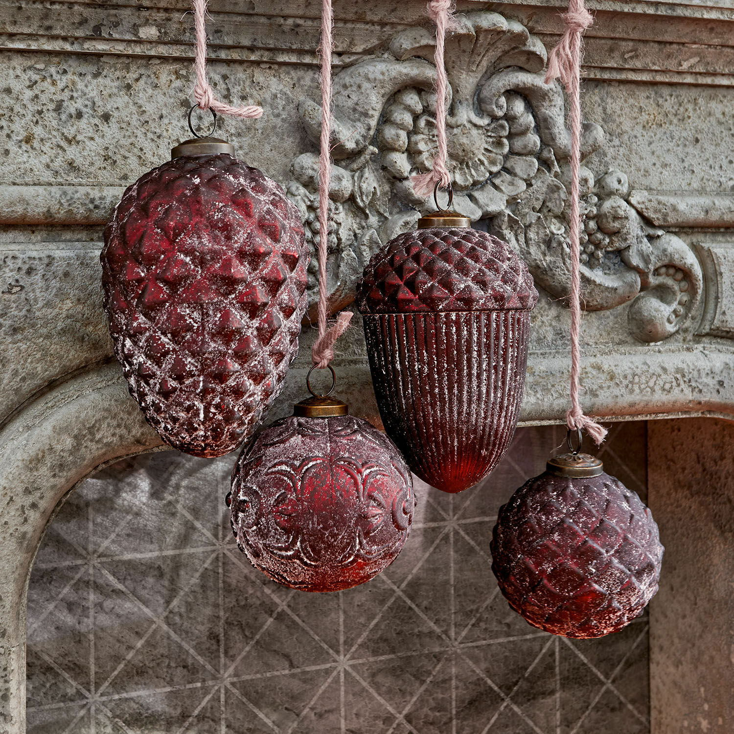 Christbaumkugeln sind echte Klassiker für die Weihnachtszeit – und können nicht nur am Weihnachtsbaum zu wunderschönen Szenarien inspirieren. Dieses Weihnachtsschmuck-Set entfacht schon beim Auspacken eine magische Wirkung. Gleich vier unterschiedliche Glaskugeln wetteifern um Aufmerksamkeit und zeigen sich in besonderer Formgebung und ganz individuellem Strukturmuster. Vollendet wird jede Kugel mit einer passenden Eisenkappe, durch deren Ring eine Kordel oder ein Seidenband als Aufhängung befestigt werden kann. Lassen Sie sich verzaubern von diesen außergewöhnlichen Schmuckstücken, die durch ihren nostalgischen Charme vielleicht auch bei Ihnen Kindheitserinnerungen wecken. Und zum Dekorieren sind sie ein echter Blickfang: So verstehen sich die Glaskugeln mit Kiefernzweigen einfach wunderbar und unterstreichen das rustikale Flair Ihres Landhaus-Stils. Auch in großen Schalen lassen sie sich mit Kerzen und schönen Accessoires stimmungsvoll arrangieren.