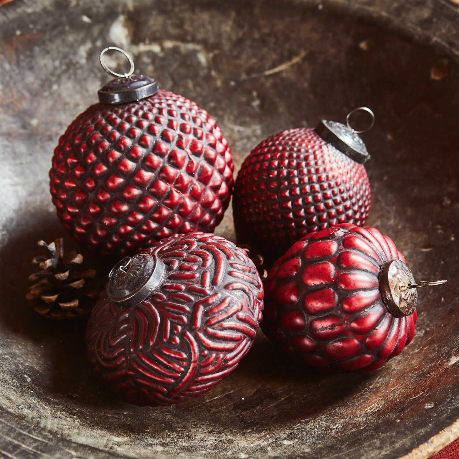 Christbaumkugeln sind echte Klassiker für die Weihnachtszeit – und können nicht nur am Weihnachtsbaum zu wunderschönen Szenarien inspirieren. Dieses Weihnachtsschmuck-Set entfacht schon beim Auspacken eine magische Wirkung. Gleich vier unterschiedliche Glaskugeln wetteifern um Aufmerksamkeit und zeigen sich in besonderer Formgebung und ganz individuellem Strukturmuster. Vollendet wird jede Kugel mit einer passenden Eisenkappe, durch deren Ring eine Kordel oder ein Seidenband als Aufhängung befestigt werden kann. Lassen Sie sich verzaubern von diesen außergewöhnlichen Schmuckstücken, die durch ihren nostalgischen Charme vielleicht auch bei Ihnen Kindheitserinnerungen wecken. Und zum Dekorieren sind sie ein echter Blickfang: So verstehen sich die Glaskugeln mit Kiefernzweigen einfach wunderbar und unterstreichen das rustikale Flair Ihres Landhaus-Stils. Auch in großen Schalen lassen sie sich mit Kerzen und schönen Accessoires stimmungsvoll arrangieren.