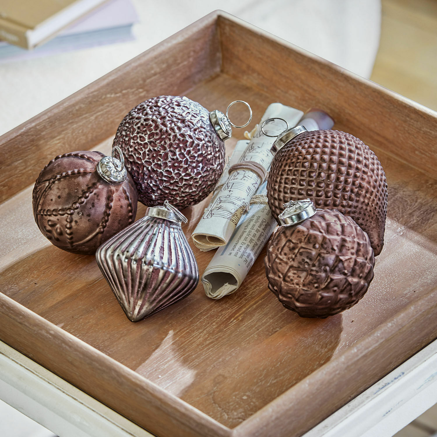 Der Adventskranz auf dem Tisch im Speisezimmer, der Mistelzweig an der Wohnungstür, die Orangen und Walnüsse mit dem Nussknackermännchen, Lichterketten, Norwegerpulli, Hüttenschuhe, Glühweinduft und knisterndes Kaminfeuer – es sind die vielen liebenswerten Details, die Weihnachten ausmachen und für die einzigartige Atmosphäre der schönsten Zeit im Jahr sorgen. Dieses Weihnachtsschmuck-Set macht es Ihnen leicht, Ihre Kreativität voll auszuleben. Das Fünfer-Ensemble aus Glas mit bezauberndem Antik-Finish bietet Ihnen verschiedene Formen, die alle charakteristisch für Weihnachten sind. Dabei erscheint jede Form in einem anderen Licht durch Form und auch wundervollem Finish. Hängen Sie die kleinen Schmuckstücke an Zweige, legen Sie sie in schöne Vasen oder dekorieren Sie damit Ihre Festtafel. Ob einzeln oder in stilvoller Kombination – für stimmungsvolle Akzente ist gesorgt.
