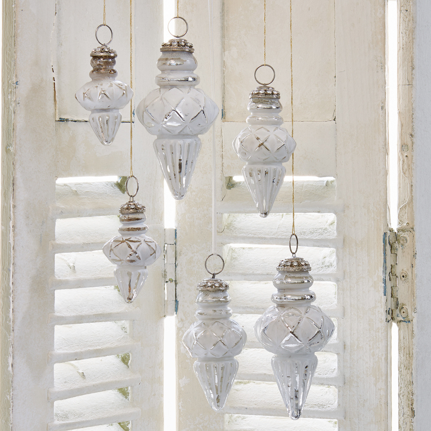 Für stimmungsvollen Weihnachtsglanz im Haus sorgt dieses zauberhafte Set. Die tropfenförmigen Schmuckstücke aus Glas weisen einen wunderschönen Schliff auf. Bauernsilber, ein traumhaftes Antik-Finish und zauberhafte Messingkappen unterstreichen das romantische Design und die zarte Vintage-Note. Zum Grün des Weihnachtsbaums entfaltet sich dieser nostalgische Charme besonders schön. Zusammen mit weißen Stoffschleifen oder gläsernem Baumschmuck ergibt sich ein wunderschöner und sehr festlicher Anblick. Das Set ist ein Must-Have für Liebhaber romantischer Einrichtungsstile wie dem Shabby-Chic oder dem Landhaus-Stil.