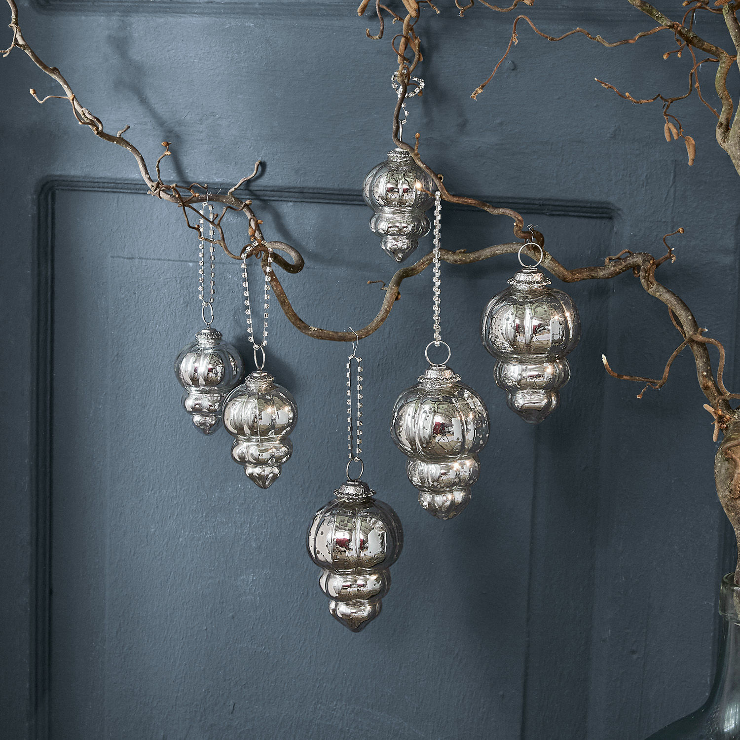 Das sechsteilige Aufhänger-Set wirkt sehr hochwertig und elegant. Die Liebe zum Detail endet nicht bei den kunstvoll geformten Glasanhängern, denn auch die mitgelieferte Kette wurde verziert – mit glitzernden Steinen. Perfekt auf die charmanten Glaskörper abgestimmt, die antiksilber veredelt wurden und im Schein der Weihnachtsbeleuchtung wunderbar schimmern.