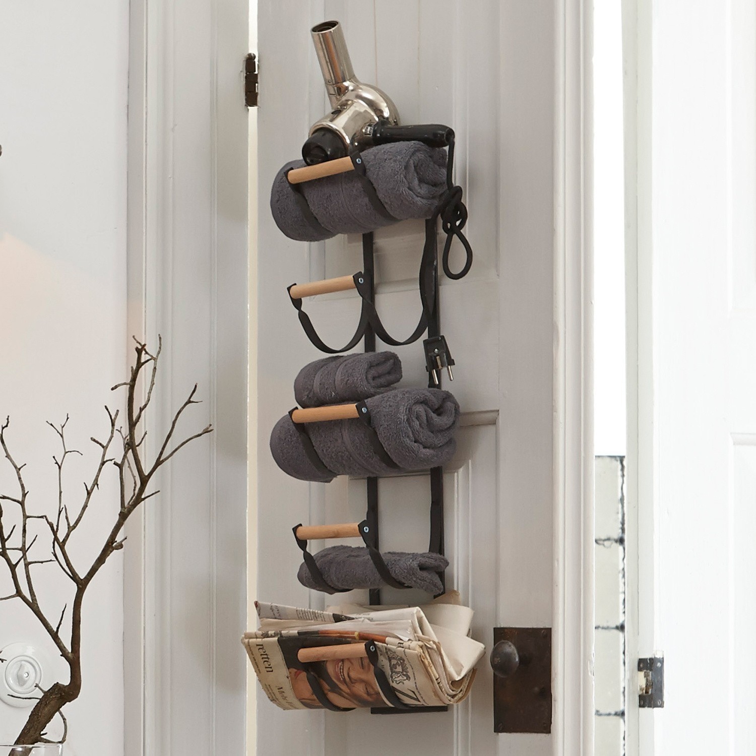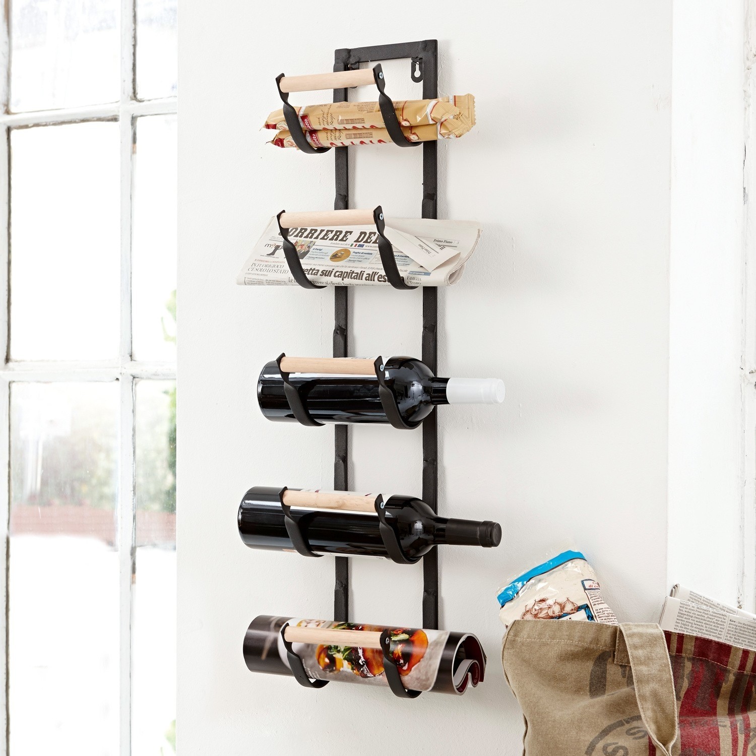 Dieser Wandhalter erfüllt theoretisch tatsächlich in jedem Raum Ihres Zuhauses einen Zweck. Ob wie gedacht – als Weinhalter für bis zu fünf Flaschen Ihrer liebsten Tropfen – oder zur Aufbewahrung von Zeitungen und Magazinen, Handtüchern, Schals und Tüchern oder Küchenutensilien (zum Beispiel das Nudelholz). Ganz nebenbei ist es natürlich schon in sich ein dekoratives Element. Der Weinhalter aus lackiertem Eisen und hellen Holzrollen wird mit zwei Schrauben an der Wand befestigt und hält so garantiert jedem Stilwechsel stand. Denn: Dieses Design ist zeitlos, edel und gut.