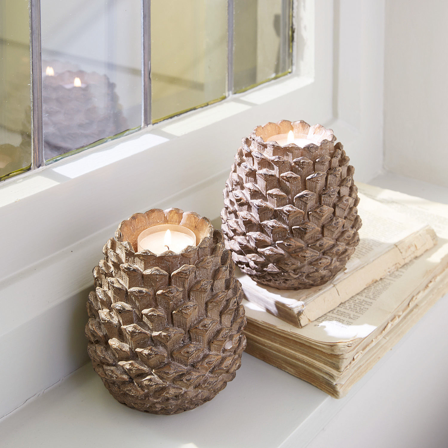 Ein ausgesprochen reizendes Duo aus Polyresin, das wie ganz natürliche Tannenzapfen aussieht. Sie sind detailreich nachgebildet und sehen wirklich aus wie Fundstücke aus dem Wald. Träumen Sie sich hiermit in die Natur und lassen Sie die Seele baumeln. Beinahe meint man, bei diesem Anblick den Duft von Erde und Tannennadeln zu riechen – eine schöne, gedankliche Auszeit in unserer hektischen Welt. Entzünden Sie Teelichter darin und freuen Sie sich über ein besonders heimeliges Gefühl. Allein oder zu zweit aufgestellt, hiermit wird es einladend. Eine Prise Country-Charme ziert so jeden Raum, ob im Schlafzimmer für eine heimelige Atmosphäre, auf dem Esstisch im Wohnzimmer, als einladender Gru0ß auf der Fensterbank platziert oder auch, um Küche und Bad stilvoll zu illuminieren. Das heimische Schaumbad wird damit zur Wellness-Anwendung. Und auch zum Landhaus-Stil macht das Doppel eine ausgezeichnete Figur. Wer möchte, dekoriert sie mit Blättern, Nüssen und anderen schönen Dingen aus der Natur und lässt so kreative Arrangements entstehen. doch auch ganz pur sind die Schmuckstücke einfach eine Augenweide, die das ganze Jahr über Freude macht. Alternativ lassen sich auch kleine Dinge wie etwa Münzen darin verwahren.