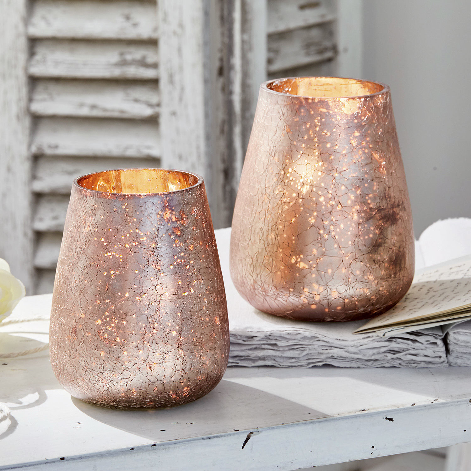 Romantische Nostalgie im Bauernsilber-Stil – freuen Sie sich auf zwei wahre Kunstwerke aus feinem Glas. Die formschönen Windlichter kommen im Set in zwei Größen zu Ihnen. Sobald Sie darin Stumpenkerzen oder Teelichter entzünden, erleben Sie wundervolle Lichtspiele. Denn fällt der Kerzenschein durch das in Bauernsilber-Optik verzierte Glas, tanzen wunderhübsche Lichtpunkte durch Ihr Zuhause. Beispielsweise zum Shabby-Chic gelingt Ihnen hiermit eine stilsichere Dekoration, die auch für besondere Gemütlichkeit sorgt – und das in jeder Saison. Zum Abendessen, beim Sonntagsfrühstück oder auf dem Balkon beim Sterne anschauen – warmes Kerzenlicht ist immer ein zauberhafter Begleiter. Alternativ könnten Sie auch kleine Gegenstände in den eleganten Windlichtern verwahren, oder Sie bestücken sie mit frischen Blüten und machen ganz kreativ eine kleine Vase daraus. Zeitloser Chic mit dem Charme früherer Zeiten, der Ihr Zuhause adelt.