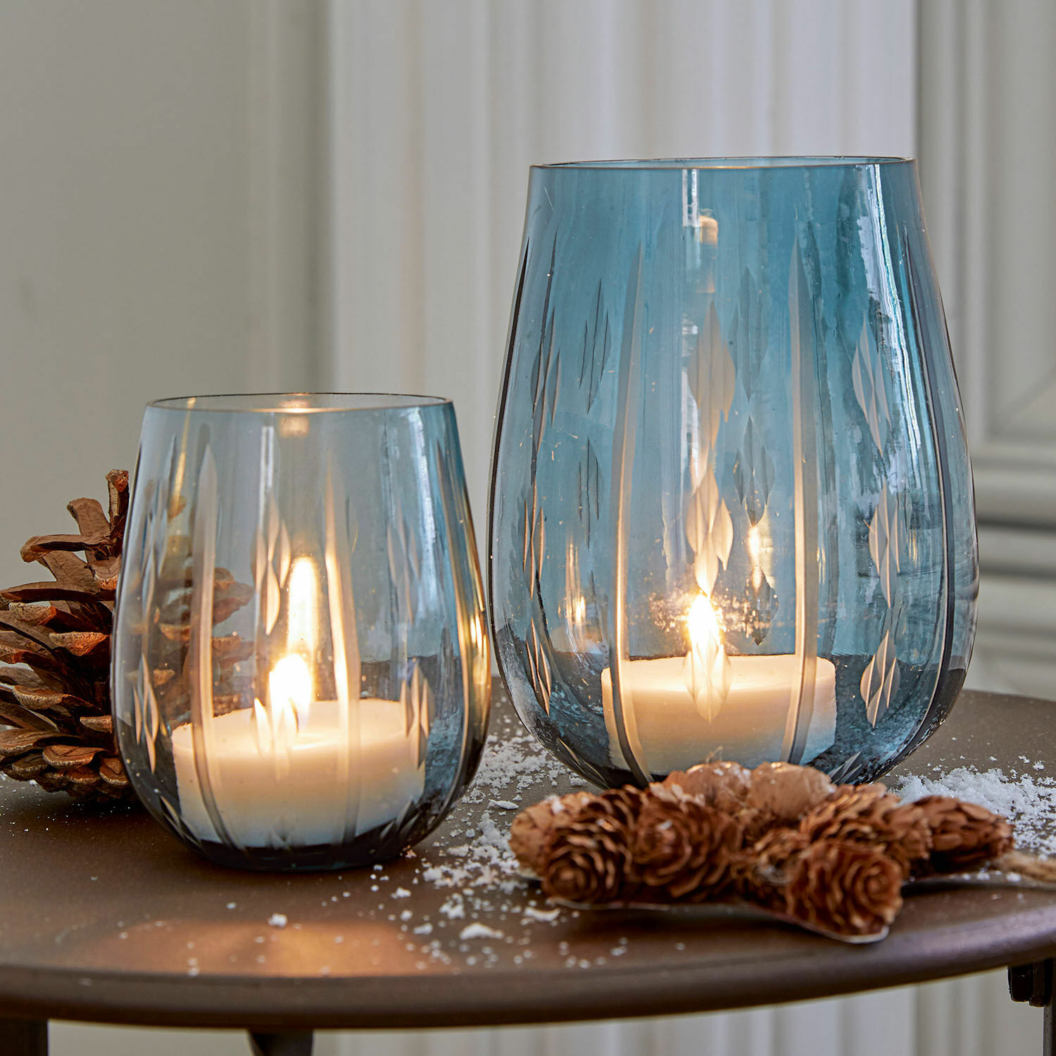 Dieses Set ist die perfekte Verkörperung traditioneller Handwerkskunst. Das Glas ist mundgeblasen, was sich in einer leichten Unregelmäßigkeit der Oberfläche äußert, die die Gläser noch charmanter macht. Allein das erzeugt schon ein besonders Kerzenleuchten. Dazu kommt noch ein wundervoller Schliff, der in Handarbeit aufgetragen wurde. So erhält das Set im wahrsten Sinne des Wortes noch den letzten Feinschliff. Die feinen Muster sind nicht nur äußerst hübsch anzusehen – sie fühlen sich ebenso schön an. Das dunkle Glas verleiht dem Kerzenschein eine gedämpfte und harmonische Note. Kurz: Dieses stilvolle Duo ist perfekt, um die Wohlfühlatmosphäre eines romantischen Dinners oder erholsamen Vollbades abzurunden.