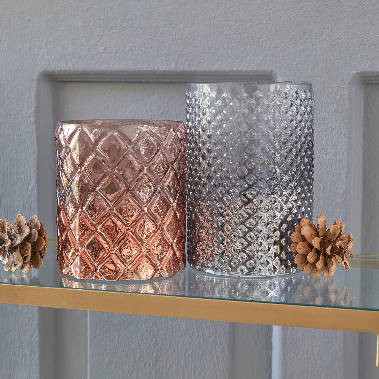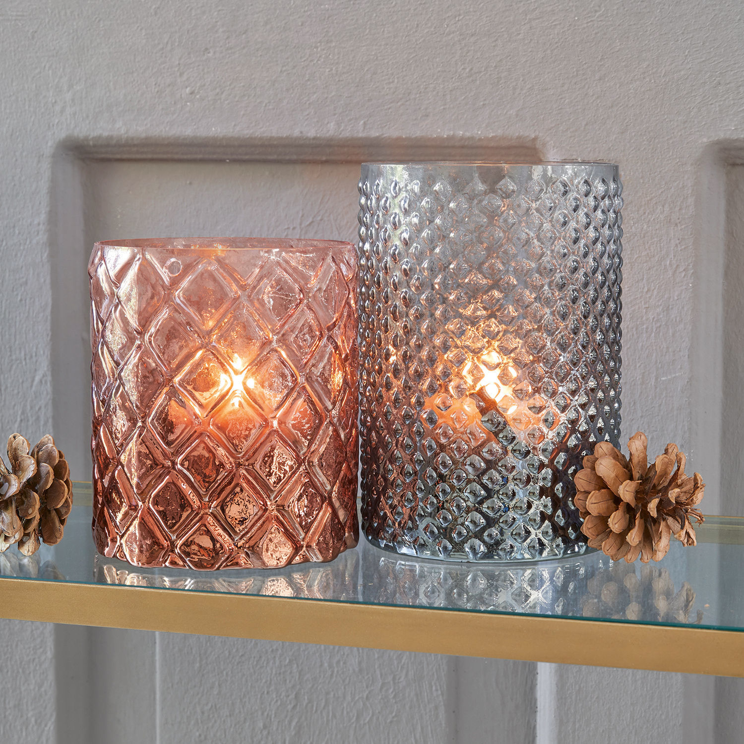 Bringen Sie mit diesem kunstvoll gearbeiteten Set den romantischen Schein von sanftem Kerzenlicht in Ihr Zuhause oder bringen Sie es als Einweihungsgeschenk mit! Es ist perfekt, um alles von handelsüblichen Teelichtern oder LED-Girlanden bis hin zu Glasperlen und getrockneten Blumen zu präsentieren. Das Set enthält zwei Windlichter in zwei unterschiedlichen Größen. Ein charmantes Detail: Neben der Tönung unterscheidet sich auch die Musterprägung der Windlichter. Die Größe des Rautenmusters variiert, sodass ein homogener und dennoch abwechslungsreicher Look entsteht. Nicht nur deshalb machen die Windlichter auf dem Kaminsims, Couchtisch und natürlich auch auf der Küchentheke eine richtig gute Figur.