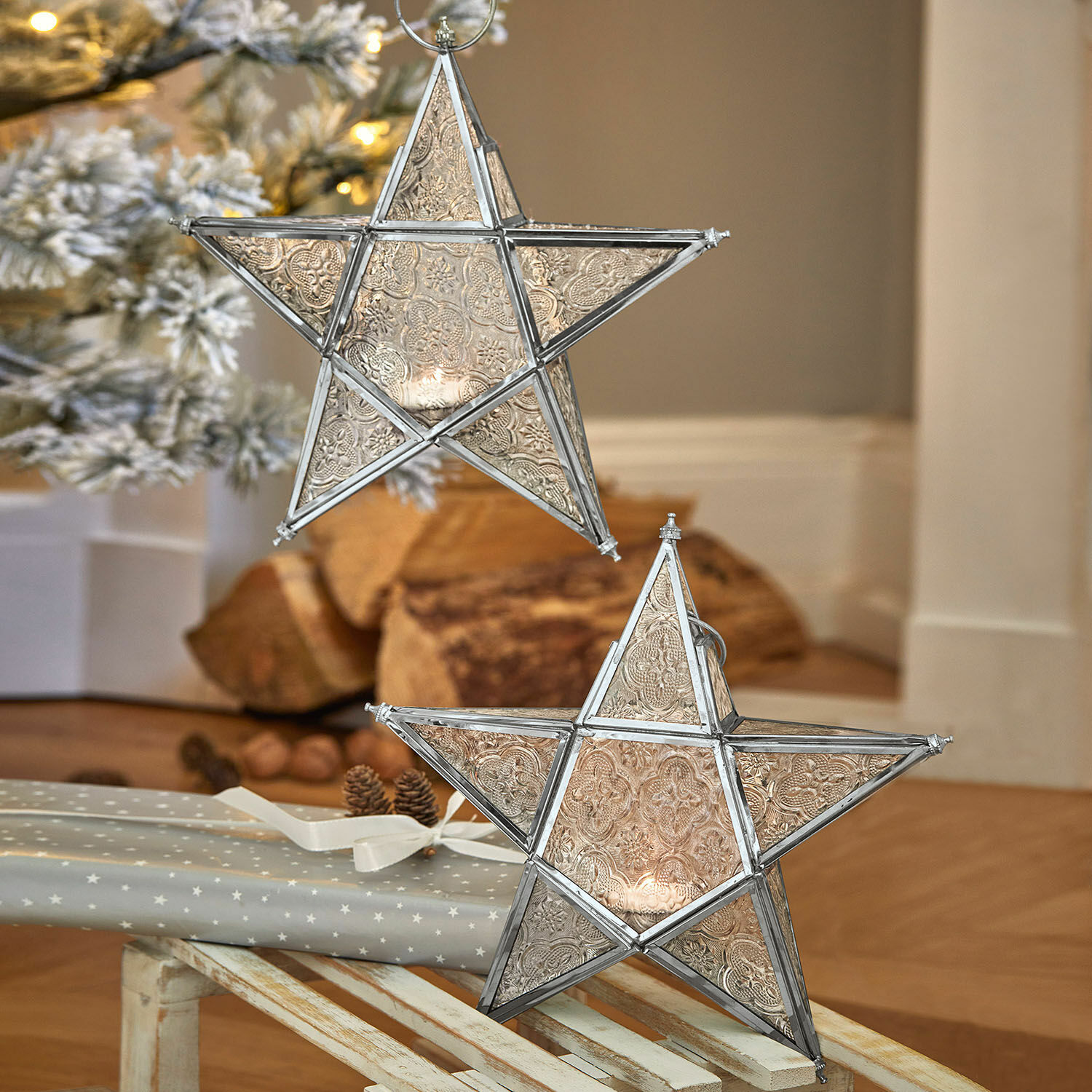Das sternförmige Windlicht kommt gleich im Doppelpack zu Ihnen nach Hause. In Handarbeit aus Messing und Eisen gefertigt, scheint durch die flächigen Glaseinsätze flackernder Kerzenschein. Über ein Türchen vorne lässt sich das Windlicht mit Hängevorrichtung öffnen um ein Teelicht einzustellen.