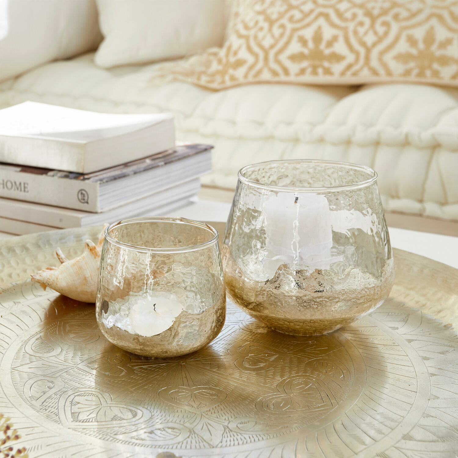 Kleine Deko-Objekte können eine unwiderstehliche Anziehungskraft ausüben. Das stellt auch dieses edle Windlicht-Set aus mundgeblasenem Glas unter Beweis. Durch die kunstvolle Technik erhalten sie eine schöne, unebene Struktur, die nicht nur einzigartig aussieht, sondern auch haptisch ein Genuss ist. Das effektvolle Finish bekommen die Accessoires durch die goldfarbene Beschichtung im unteren Bereich – ein faszinierender Effekt, fast könnte man meinen, die Gläser wären in Gold getaucht. Bestückt mit einem Teelicht entsteht ein schönes warmes Licht, das überall einen geheimnisvollen Zauber versprüht. So wird Ihre festlich gedeckte Tafel noch stimmungsvoller und Ihr Abend auf der Terrasse noch gemütlicher. Ein wunderschöner Lichtakzent für jede Jahreszeit und jede Gelegenheit. Teelichter sind im Lieferumfang nicht enthalten, so haben Sie die Wahl, ob Sie lieber klassische oder duftende Teelichter einsetzen möchten.