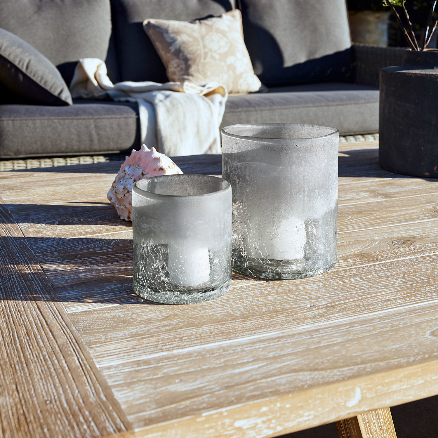 Dieses elegante Duo bezaubert mit außergewöhnlichem Design. Die beiden Windlichter aus Glas haben einen reizvollen Ombre-Effekt, der durch einen schönen Crinkle-Optik im oberen Bereich entsteht, welcher an haarfeine Risse im Glas erinnert. So entsteht ein innovativer Charakter, mit dem die klare Formgebung bestens harmoniert. Im Set erhalten Sie zwei Größen. Hier können Sie aber nicht nur Teelichter oder Stumpenkerzen hineinstellen. Auch Gräser, Zweige und Bouquets lassen sich wunderschön arrangieren oder Trockenblumen als langlebige Kunstwerke darin anrichten. Im Wohnzimmer, den Schlafräumen oder auch in der Küche kommt so die Natur in Ihr Haus. Und auch als Stiftehalter, für Schminkpinsel oder zur Aufbewahrung kleiner Gegenstände bieten die formschönen Windlichter sich jederzeit an.