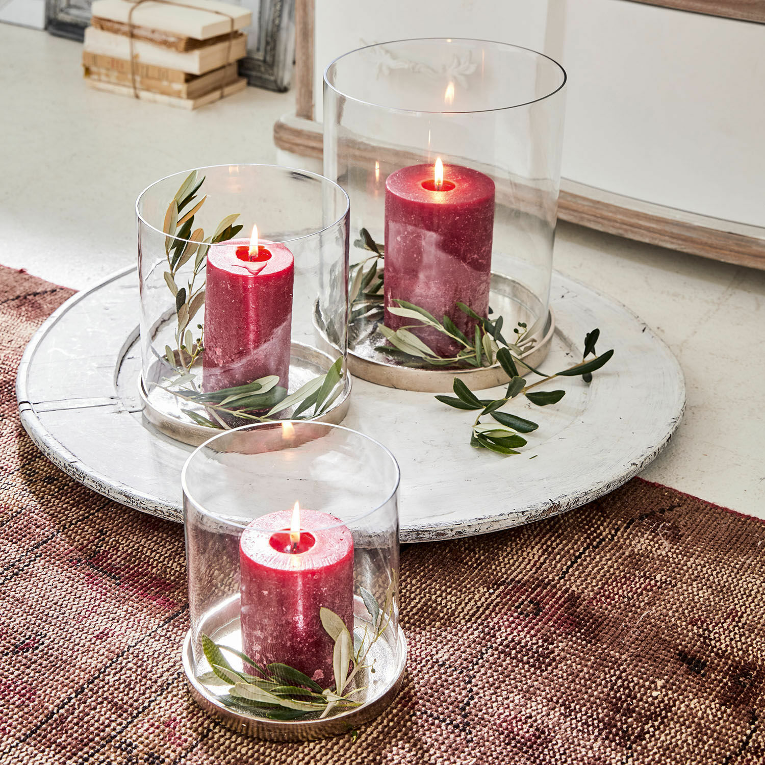 Bringen Sie mit echtem Kerzenschein faszinierendes Licht ins Dunkel: Die eleganten Windlichter in unterschiedlichen Größen machen es Ihnen leicht. Entzünden Sie beispielsweise verschiedene Kerzen und erleben Sie am Abend, wie ein kunstvolles Arrangement dieser Schmuckstücke reizende Lichtspiele in Ihrem Zuhause kreiert. Die eingelassenen Glasscheiben gewähren freien Blick auf das Innere, das Sie beispielsweise mit einer großen runden Kerze oder mit mehreren kleineren Stumpenkerzen bestücken können. In jedem Fall wird die klare Form der Windlichter den Lichterschein wunderbar hervorheben und für eine stimmungsvolle Atmosphäre in Ihrem Heim sorgen. Bei der Wahl der Kerzen sind Sie ganz frei, da diese nicht im Lieferumfang enthalten sind. Wenn Sie möchten, platzieren Sie die hellen Helfer zusammen mit Möbeln und Accessoires im französischen Landhaus-, Industrial- oder Country-House-Style. Durch ihre zurückhaltende Gestalt passen sie in jedes Wohnambiente. Der Boden ist zudem aus glänzendem Aluminiumguss gefertigt, dem man das Gussverfahren noch deutlich ansieht. So bietet auch der Boden eine hübsche Struktur und natürlich guten Halt für Ihre Kerzen.