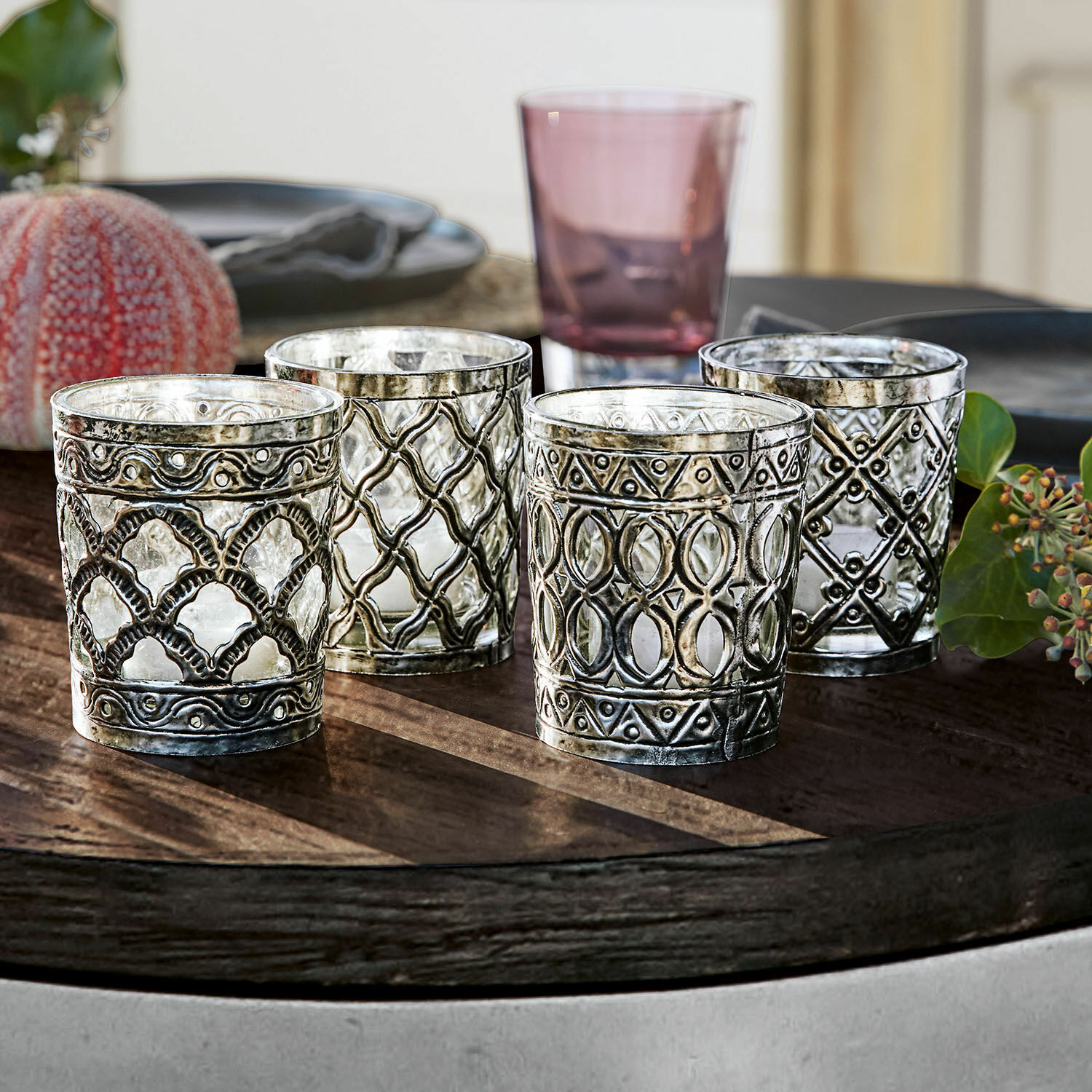 Wer heimeligen Kerzenschein mag, wird dieses detailreich designte Quartett lieben. Vier Windlichter aus Glas wurden mit einer Ummantelung aus Messing versehen, die kunstvoll von Hand geschnitzt und verziert ist. Jedes Modell ziert ein eigenes Muster. Stellen Sie einfach Teelichte ein und freuen Sie sich über kleine Glanzpunkte mit silbrigem Schimmer in Ihrem Zuhause. Das Set passt wunderbar zum Shabby-Chic, es hat aber auch einen leicht orientalischen Touch. Ob als Grüppchen oder solo, es zaubert mühelos eine Extraportion Charme in jeden Raum. Eine Idee: Wer mag, kann die kleinen Windlichter auch als Mini-Vasen für Blüten nutzen.