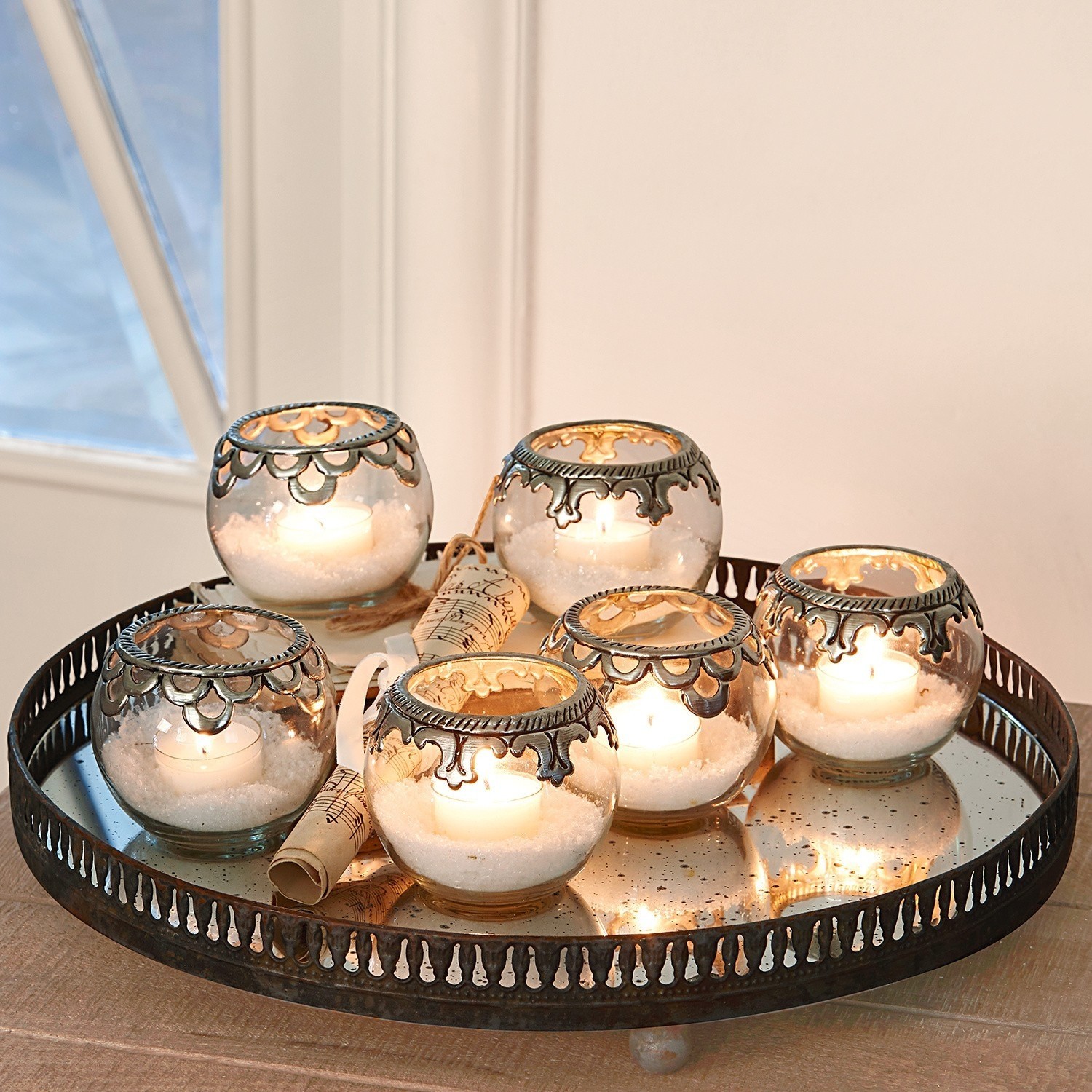 Kerzenlichtzauber im 6er Set – einfach perfekt für graue und kalte Wintertage. Die hübschen Windlichter aus klarem Glas sind mit zwei Arten zauberhafter Ornamente verziert. Sie bestehen aus Messing und sind kunstvoll gearbeitet. Die runde Form des Glases wirkt freundlich und heimelig. Entzünden Sie Teelichter darin und freuen Sie sich über eine besonders festliche und schöne Stimmung in Ihrem Zuhause. Als Grüppchen ein sehr hübscher Effekt, aber auch einzeln genutzt ist jedes für sich ein kleiner Hingucker. Ein Hauch Exotik schwingt bei diesem Design mit. Die kleinen Glasschätze könnten auch ein Mitbringsel von einem orientalischen Basar oder aus Indien sein. Ideal zum Shabby-Chic und für einen Hauch Bohème-Feeling.