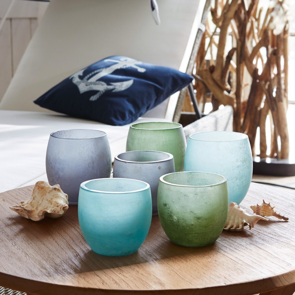 Die Farben dieser Windlichter erinnern an blaues Wasser, frisches Grün und felsige Ufer. Genießen Sie diese sommerfrischen Farben und lassen Sie sich zu eigenen Dekorationsideen inspirieren. Das Set umfasst 6 Gläser in drei Farben. Sie erhalten je Farbe ein großes und ein kleineres Glas, die beide genug Bodenfläche für Kerzen oder große Teelichter bieten. Außen sind die Gläser gefrostet, was den Windlichtern ein wunderbares Lichtspiel bringt. Ob Sie auf dem Balkon den Abend ausklingen lassen oder auf dem Sofa, das wabernde Licht der Kerzen entspannt und verwöhnt − die Windlichter, sind überall im Haus eine angenehme und stilvolle Dekoration, die bestückt mit Kerzen ihren tänzelnden Schatten auf die dezenten Farben wirft. Im dunklen Garten kommt dieses eindrucksvolle Windlicht Set aus hochwertig verarbeitetem, buntem Glas übrigens ebenfalls wunderbar zu Geltung