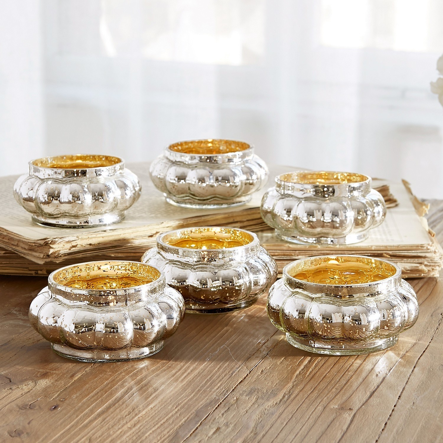 Zu den absoluten Deko-Basics gehören diese sechs ganz sicher: Ein Windlichter-Set aus Glas mit glänzendem Bauernsilber-Finish. Jeweils passend für ein großes Teelicht. Und das ist ganz Besonders: Die bauchige aber relativ flache Form dieser Windlichter lässt es zu, dass die Flammen der Kerzen darin ein wenig heraus züngeln – ein toller Effekt. Arrangieren Sie die Windlichter zusammen, verteilt über Ihre festlich gedeckte Tafel, umrahmt von weißem Leinen, edlem Kristall und Silberbesteck. Oder Sie platzieren die silberfarbenen Teelichthalter in kleinen Gruppen von zwei oder drei Exemplaren – auf einem Beistelltisch oder dem Kaminsims.