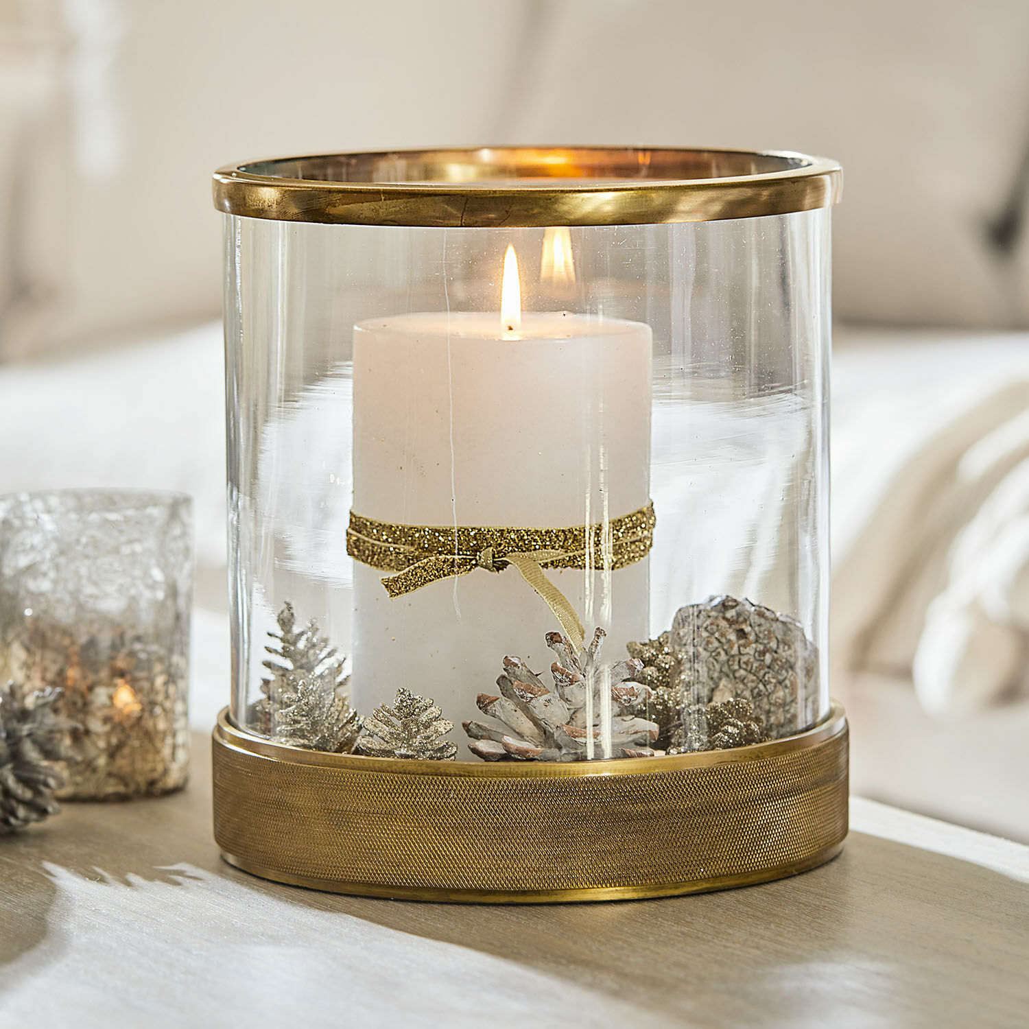 Romantisches Kerzenlicht erhält mit diesem Windlicht eine besonders stilvolle Bühne. Denn die Kombination zweier Materialwelten macht das Accessoire in Zylinderform äußerst reizvoll: Der Boden aus massivem Aluminium bildet die Basis, darauf steht ein Korpus aus Klarglas, das oben von einem dekorativen Edelstahlring fixiert ist. Und weil das Accessoire in gealtertem Zustand noch schöner wirkt, sind die Metallelemente mit einem goldfarbenen Antik-Finish veredelt. Ein Schmuckstück, das gemütliche Abende stimmungsvoll untermalt und nicht nur Ihrer festlich gedeckten Gästetafel Lichterglanz verleiht, sondern auch auf der Fensterbank oder im Eingangsbereich einen wunderschönen Akzent setzt. Praktisch: Für das unkomplizierte Bestücken mit einer Kerze ist das Glas abnehmbar. Eine Kerze ist jedoch im Lieferumfang nicht enthalten.