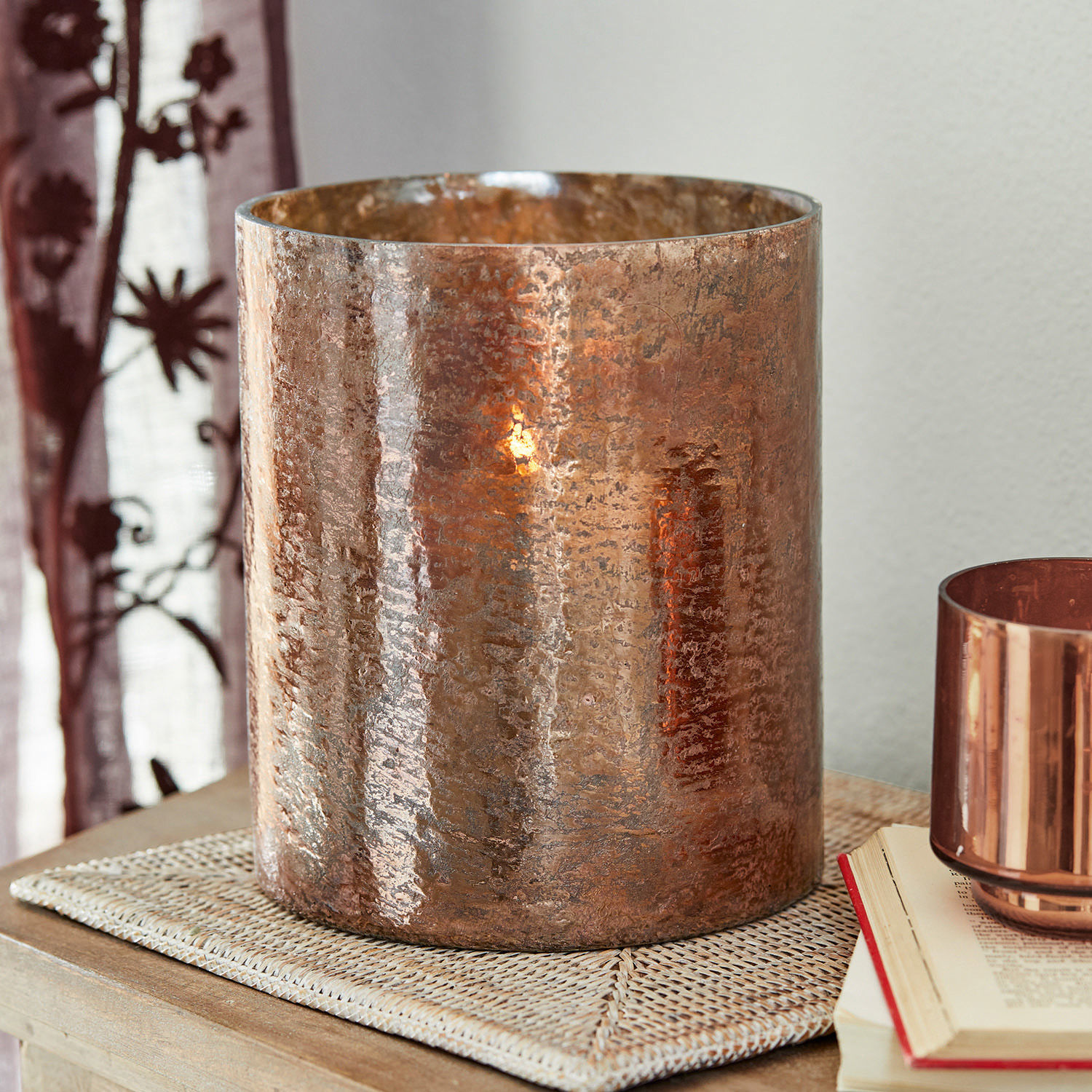 Ein reizendes Design aus Glas mit Metallic-Finish und interessanter Rost-Optik. So entsteht eine einzigartige Anmutung, die gut zum Shabby-Chic passt. Das charmante Windlicht sorgt mit Teelichtern oder einer Stumpenkerze befüllt für reizvolle Lichtreflexe und zaubert eine Extraportion Gemütlichkeit ins Schlafzimmer, auf die Fensterbank oder in das Wohnzimmer. Auch auf einer Konsole oder einer Kaminumrandung platziert kommt es wunderbar zur Geltung. Alternativ lässt das edle Modell sich sehr gut als Vase nutzen und verhilft Wildblumen oder duftenden Rosen zum großen Auftritt. Und auch als Aufbewahrung für kleine Dinge wie Stifte, Schminkpinsel, Haarnadeln, Münzen oder Knöpfe eignet das schicke Design sich. Ein echtes Multitalent also. Arrangieren Sie es vielleicht mit anderen Kerzenhaltern und Windlichtern, um ein einzigartiges und kreatives Ambiente zu schaffen.