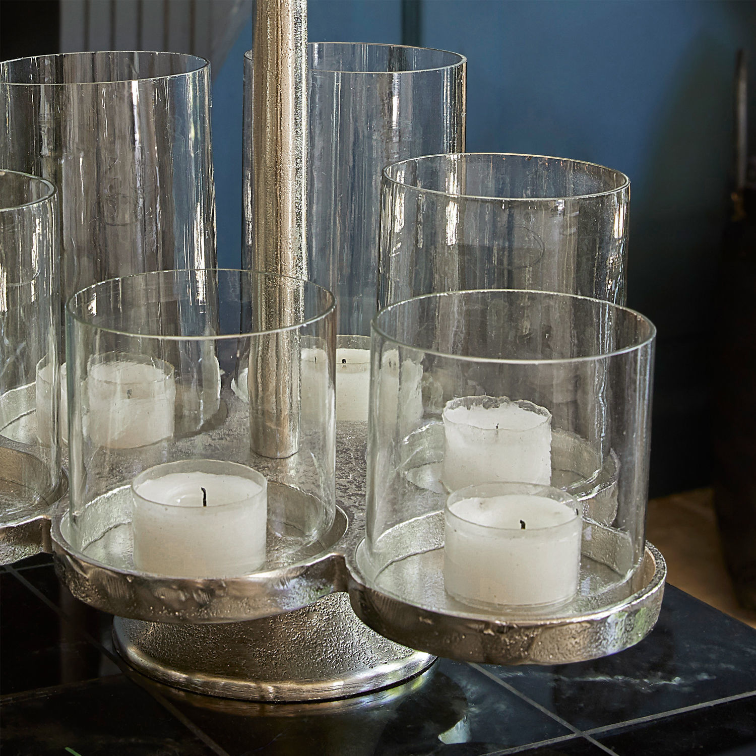 Windlichter sind nicht nur perfekt, um einen Raum ganz einfach stimmungsvoll zu inszenieren. Sie können damit auch die Strahlkraft saisonaler Dekorationen intensivieren. Dieses besondere Modell setzt überall perfekte Akzente, ganz egal, ob auf dem Wohnzimmertisch, einem Regal oder als charmanter Lichtspender im Freien. Das Design erinnert an antike Chai-Träger, mit denen früher auf dem Basar köstlicher Tee serviert wurde. Die gläsernen Zylinder sind abnehmbar und ruhen auf kleinen, vertieften Tellern. Dieses Gestell weist eine besonders raffinierte Struktur auf und punktet mit einem eleganten Glanz aus Aluminiumguss. Gekrönt wird der zeitlose Look von einem großzügig dimensionierten Tragering. Das hochwertige Schmuckstück ist mit handelsüblichen Teelichtern kompatibel, doch kreative Geister können die Zylinder auch mit Muscheln, Potpourri oder LED-Lichtern füllen.