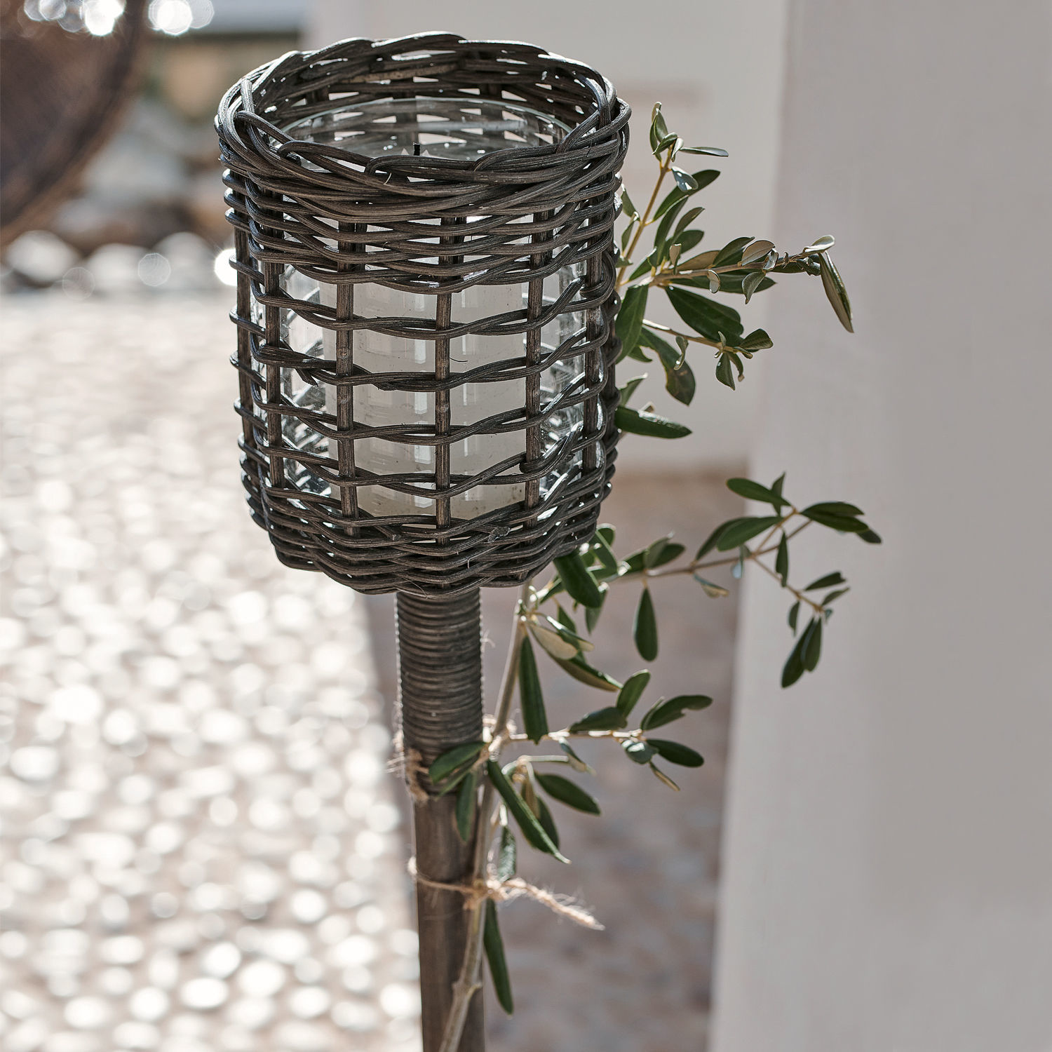 Eigentlich müsste man dieses Windlicht bereits als Laterne bezeichnen, schließlich handelt es sich um ein raffiniertes Gesamtkunstwerk aus mehreren Komponenten. Es besteht aus einem langen Stab und einem handgeflochtenen Rattan-Korb, der das gläserne Windlicht beherbergt. Der Stab lässt sich im Garten einfach in die Erde stecken und das macht dieses Windlicht besonders flexibel. Gartenfeiern lassen sich mit mehreren Exemplaren besonders stimmungsvoll beleuchten. Natürlich können Sie das Windlicht auch Indoor einsetzen, zum Beispiel in einer Bodenvase fixiert. Das Glas lässt sich ganz einfach aus dem Korb nehmen, um es mit einer Kerze zu bestücken.