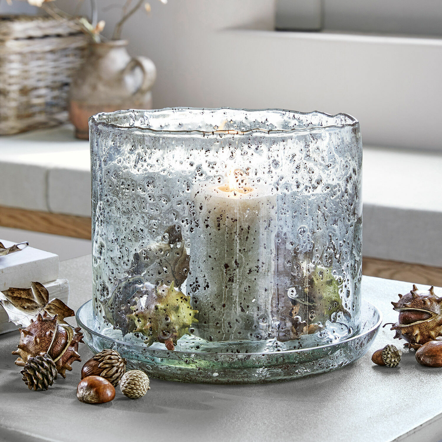 Sie lieben Kerzenschein? Dann ist dieses edle Windlicht ein Must Have. Es besteht aus dickem Glas, in welches fein eingearbeitete Farb-Elemente eingelassen sind. Das sorgt für eine interessante Struktur, und der gewellte Rand ist eine weitere Besonderheit dieses Designs. Freuen Sie sich auf reizvolle Lichtspiele bei gemütlicher Illumination und zelebrieren Sie entspannte Momente zu Hause. Ob beim Filmeabend, dem Schaumbad oder für das romantische Candlelight Dinner, mit warmem Licht wird es gleich noch heimeliger. Vor allem wenn es dunkel oder grau ist, kann man sich so noch viel besser einkuscheln. Wer möchte, könnte in dem gläsernen Accessoire auch dekorative Arrangements schaffen, etwa mit einem Potpourri oder Glitzersand und Muscheln. Und auch zur Aufbewahrung kleiner Dinge wie Knöpfe, Münzen und Haarnadeln bietet es sich an – vielseitig und ausgesprochen elegant, einfach ein wahres Lieblingsstück.