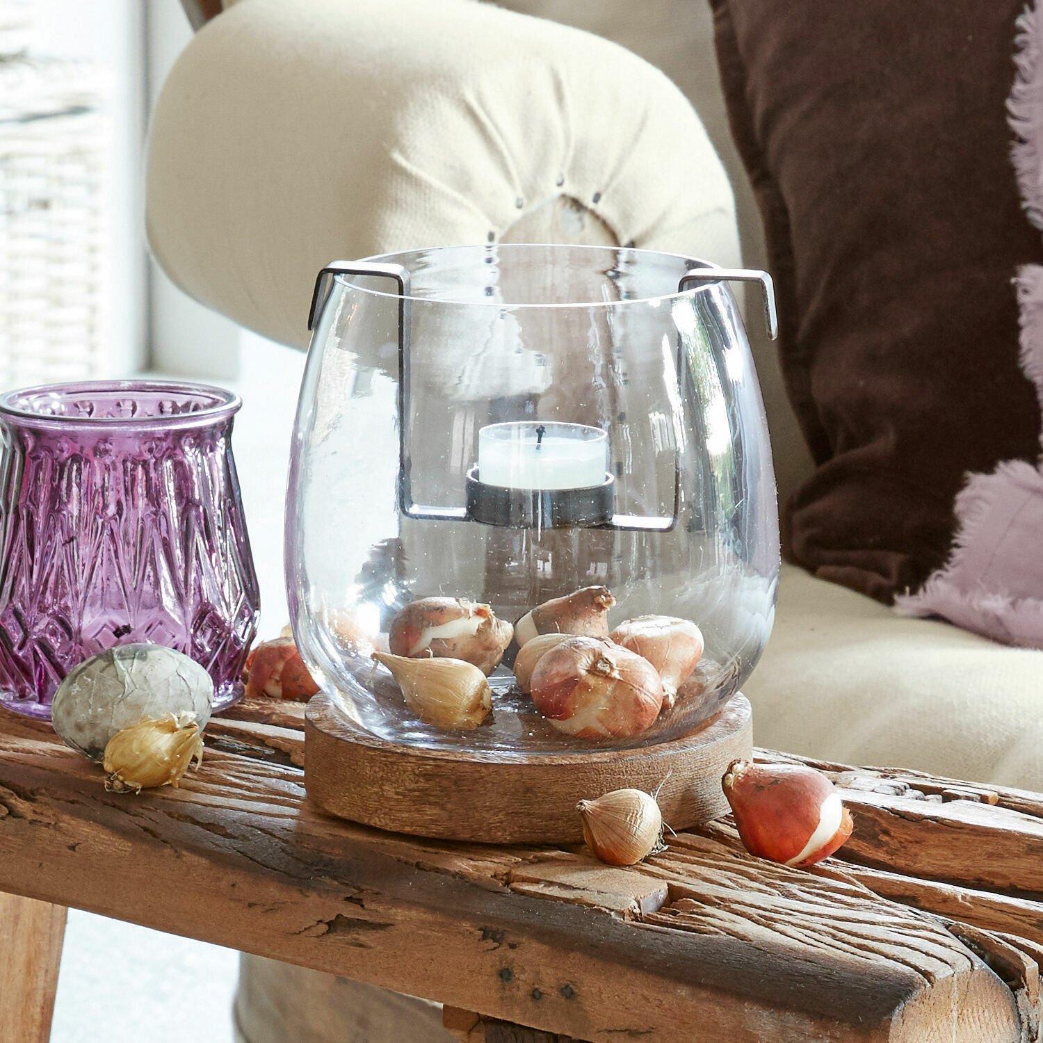 Abendessen im Kerzenschein, Illumination beim gemütlichen TV-Abend oder bei einem entspannenden Bad in der Wanne. Wenn Sie Wohlbefinden wollen, ist dieses Windlicht der ideale Partner, der nicht nur für stimmungsvolle Stunden sorgt, sondern auch durch seine stilvolle Optik zu entzücken weiß. Das zeitlose Design dieses Schmuckstücks schmeichelt im Grunde allen Wohnstilen und macht jedes Ambiente noch ein wenig schöner. Der Untersetzer ist aus schimmerndem Holz, und der nicht fixierte Eisenaufsatz begeistert durch sein nostalgisches Used-Finish. So zaubern Sie ganz leicht Stil und Charme in Ihr Zuhause. Ob auf einer Kommode, der Fensterbank, einer Konsole oder auf dem Tisch – das hübsche Objekt macht überall eine gute Figur. Da keine Kerzen im Lieferumfang enthalten sind, können Sie die Windlichter selbst mit Teelichtern schmücken und werden so viele stimmungsvolle Momente genießen.