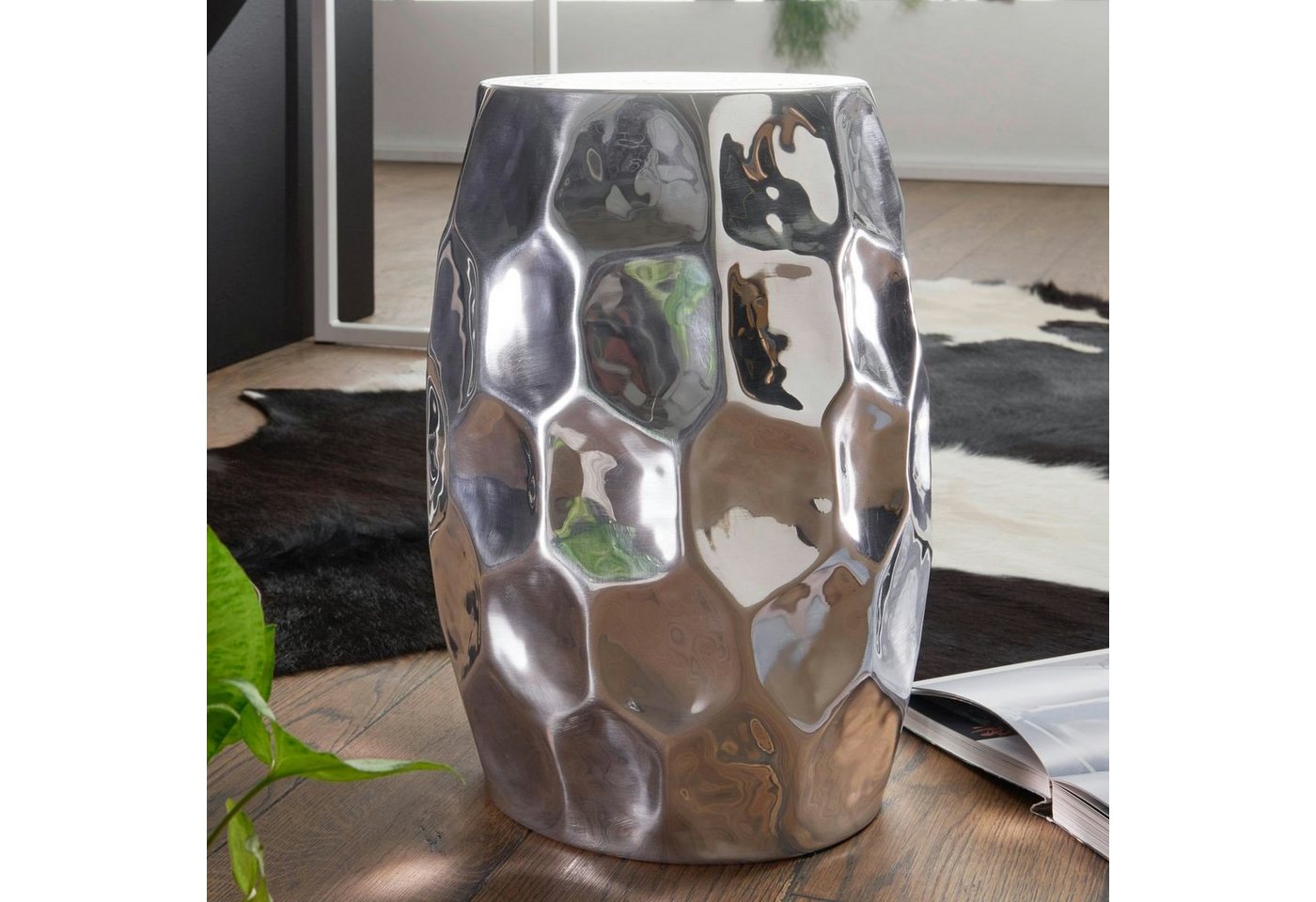 DesignAußergewöhnlicher Dekotisch im orientalischen DesignWunderschöne Hammerschlag-Strukturen auf der AblageflächeDurch die großen Wölbungen ist der Tisch ein absolutes HighlightAbmessungenBreite: 30 cmHöhe: 47 cmTiefe: 30 cmDurchmesser der Ablagefläche: 24 cmDurchmesser der Standfläche: 24,5 cmFarbeKompletter Tisch: SilberfarbenBesonderheitenEmpfohlene max. Belastbarkeit: 15 kgDurch liebevolle Handarbeit ist jeder Beistelltisch ein absolutes UnikatDa die Unterkante nach innen gefalzt ist, sind scharfe Kanten vermieden wordenHohe Stabilität durch das hochwertig verarbeitete Aluminium und die runde FormAufgrund der Handarbeit machen einzelne kleine Dellen die Dekotische zu absoluten EinzelstückenMaterialKompletter Anstelltisch: AluminiumPflegehinweiseDie Oberfläche mit einem lauwarm angefeuchteten Baumwolltuch reinigen. Bitte keine harten Bürsten oder Metallschwämme verwenden, da diese Kratzer im Metall verursachen. Keine Scheuermittel, scharfen Reinigungsmittel oder tropfnassen Tücher verwenden.LieferumfangEin Beistelltisch ohne DekorationMontageLieferzustand: Montiert und sicher verpackt