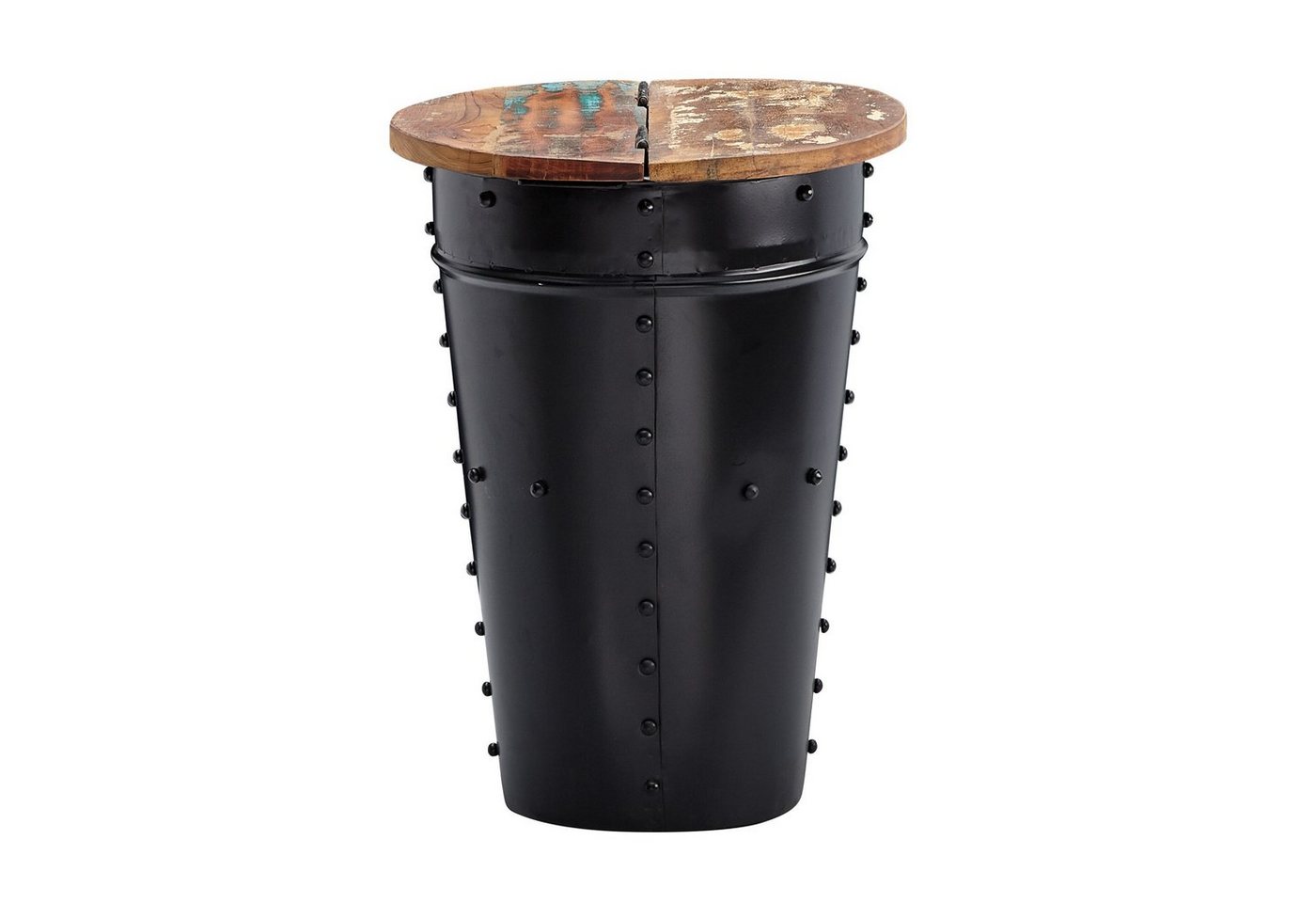 DesignAttraktiver Beistelltisch im angesagten Industrial-StilRunde Tischplatte zur Ablage von diversen UtensilienFester Stand dank des robusten MetallgestellsDekorative Nieten zieren den Körper des LoungetischsAbmessungenBreite: 36 cmHöhe: 50 cmTiefe: 36 cmTischplattenstärke: ca. 2 cmÖffnung (BxT): 30 x 15 cmWeitere Abmessungen finden Sie im MaßbildFarbeTischplatte: BraunGestell: SchwarzBesonderheitenJeder Tisch wurde in liebevoller Handarbeit gefertigt und ist somit ein absolutes UnikatAufgrund der Handarbeit kann es zu leichten Farbabweichungen und Unebenheiten kommenTischplatte lässt sich auf einer Seite hochklappen und bietet so praktischen Stauraum Die Holzoberfläche ist mit einem schützenden Klarlack versiegeltEmpfohlene Maximalbelastbarkeit: 15 kgMaterialTischplatte: Recyceltes Mango MassivholzMetallgestell: Lackiertes EisenLieferumfangEin Beistelltisch ohne DekorationMontageLieferzustand: komplett montiert und sicher verpacktPflegehinweiseDie Oberfläche mit einem lauwarm angefeuchteten Baumwolltuch reinigen. Keine Scheuermittel, scharfen Reinigungsmittel oder tropfnasse Tücher verwenden.