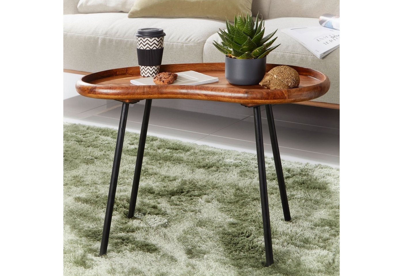 DesignCouchtisch in angesagter Retro-OptikTischplatte mit der typischen 50er-Jahre-NierenformFester Stand dank der stabilen MetallbeineAbmessungenBreite: 71 cmHöhe: 51 cmTiefe: 40 cmBoden bis Tischunterkante: ca. 46,5 cmWeitere Maße: siehe MaßbildFarbeTischplatte: Holzfarben (Sheesham)Beine: SchwarzBesonderheitenEmpfohlene max. Belastbarkeit: 50 kgHergestellt in liebevoller Handarbeit – jedes Sofatisch ein EinzelstückHolzschutz bietet die Schutzlackversiegelung der OberflächenGummierte Noppen an den Beinen bieten nicht nur Bodenschutz, sondern sind auch höhenverstellbarMaterialTischplatte: Massivholz SheeshamBeine: Eisen (lackiert)PflegehinweiseDie Oberfläche mit einem lauwarmen angefeuchtetem Baumwolltuch reinigen. Keine Scheuermittel, scharfen Reinigungsmittel oder tropfnassen Tücher verwenden. Keine weitere Behandlung der naturbelassenen Oberfläche (Ölen oder Wachsen) notwendig.LieferumfangEin Couchtisch ohne DekorationMontageLieferzustand: Teilmontiert – Beine müssen angebracht werden