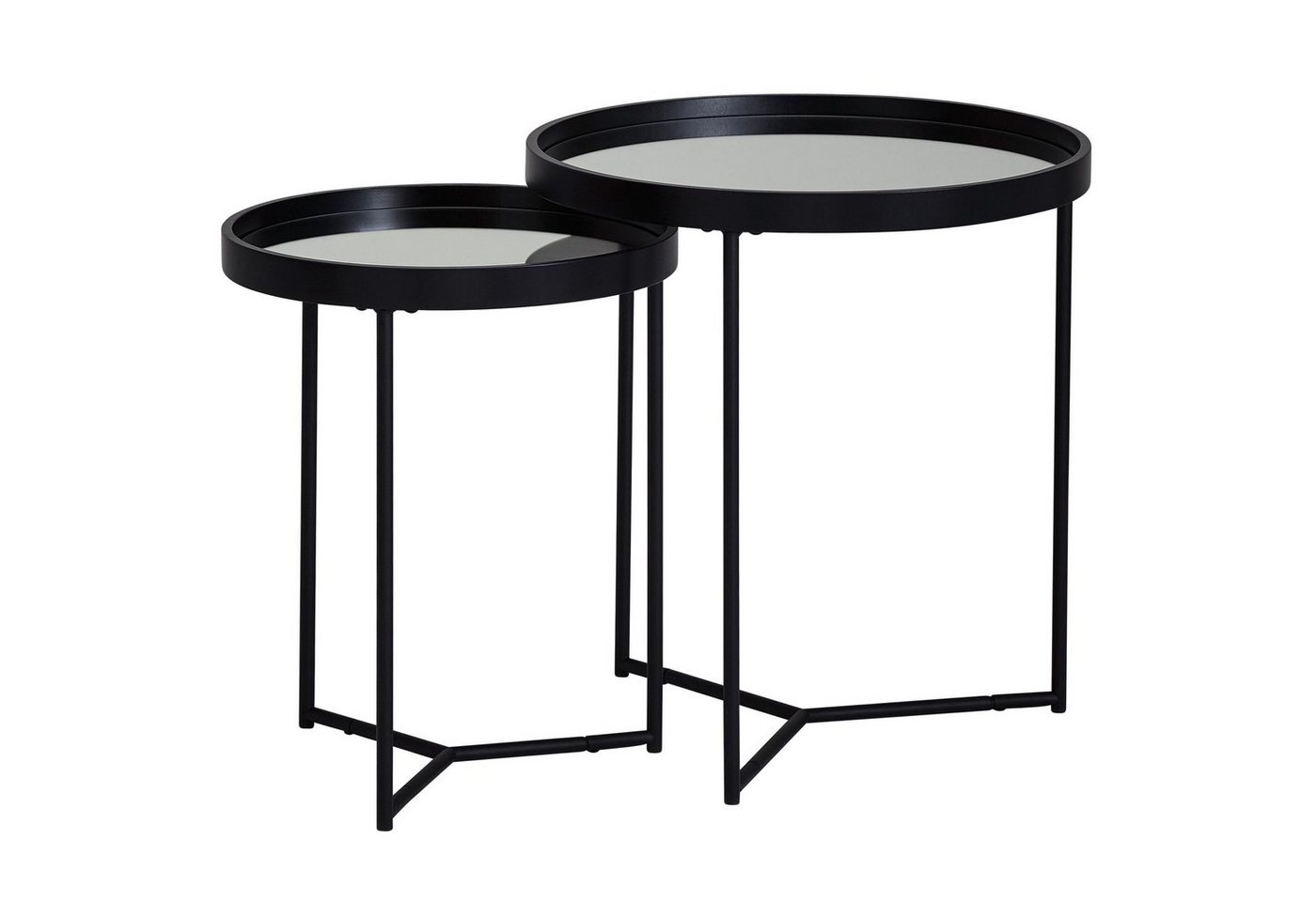 DesignZweiteiliges Satztisch-Set in moderner, eleganter OptikStimmiger Materialmix aus Metall und Holz  AbmessungenGroßer TischBreite: 45,5 cmHöhe: 50,5 cmTiefe: 45,5 cmKleiner TischBreite: 36 cmHöhe: 45,5 cmTiefe: 36 cmTischrandhöhe innen: 1,5 cmTischrandstärke: 3,5 cmFarbeKomplettes Set: SchwarzBesonderheitenEmpfohlene max. Belastbarkeit je Tisch: 3 kgIm Set oder getrennt voneinander verwendbarSicherer Stand durch die stabilen Beine Einsetzbar in vielen RäumenSchwarze Kunststoffkappen verhindern ein Verkratzen Ihres BodensMaterialTischrand: Bugholz aus Tulpenholz (lackiert)Tischplatte: Einscheiben-SicherheitsglasGestell: Stahl (pulverbeschichtet)PflegehinweiseMit feuchtem Tuch abwischen, mit trockenem Tuch nachwischen. Bei Bedarf mildes Reinigungsmittel benutzen. Keine scharfen oder lösungsmittelhaltigen Reiniger verwenden.LieferumfangEin Satztisch-Duo ohne Dekoration // Aufbauanleitung und Montagematerial inklusiveMontageLieferzustand: Zerlegt und sicher verpackt