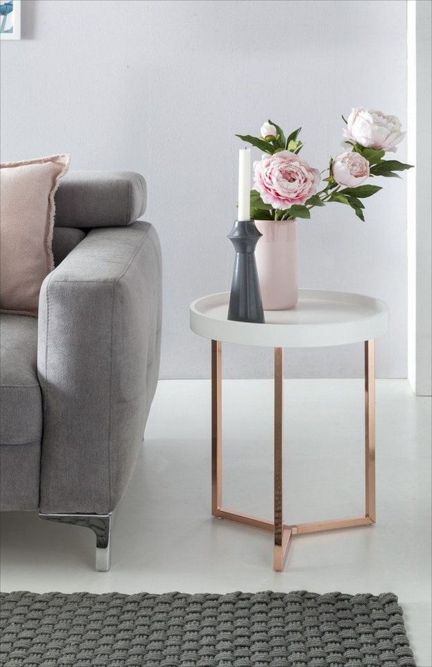 DesignStylischer Beistelltisch im Retro DesignEine runde Tischplatte / TablettKupferfarbenes Metall GestellAbmessungenHöhe: 51 cmTablett: Ø 40 cmFarbeTischplatte/Tablett: Weiß mattGestell: Kupfer glänzendBesonderheitenSehr sicheren Stand durch das BeingestellGeräumige runde Ablagefläche die zugleich ein Tablett istRutschfest durch Gumminoppen die unter der Platte und den Beinen befestigt sindDie metallenen Bauteile sind mit einer Schutzfolie überzogen – die Folie bitte nach der Montage entfernenMaterialGestell: MetallTischplatte: MDFLieferumfangEin Beistelltisch ohne DekorationMontageanleitung und Montagematerial inklusiveLieferzustand: ZerlegtPflegehinweisMit feuchtem Tuch, evtl. mit mildem Reinigungsmittel abwischen, mit trockenem Tuch nachwischen – keine scharfen oder lösungsmittelhaltigen Reiniger verwenden.