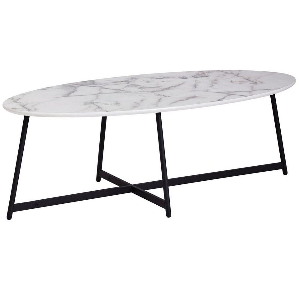 DesignOvaler Couchtisch in Marmor-OptikStylischer Wohnzimmertisch in angenehmer FarbkombinationModerner Kaffeetisch mit schwarz lackierten BeinenAbmessungenBreite: 120 cmHöhe: 45 cmTiefe: 60 cmTischplattenstärke: 2,5 cmHöhe vom Boden bis Querstrebe: 3 cmWeitere Abmessungen können Sie dem entsprechenden Maßbild entnehmenFarbeGestell: Schwarz (matt)Tischplatte: Weiß (Marmor-Hochglanz-Optik)BesonderheitenEmpfohlene max. Belastbarkeit: 10 kgSicherer Stand dank der stabilen BeinanordnungAufgrund des Designs lässt sich der Tisch in vielen Zimmern einsetzenEdles Flair dank der Marmor-OptikSchwarze Kunststoffkappen schützen Ihren Boden vor unschönen KratzernMaterialGestell: Stahl (pulverbeschichtet)Tischplatte: MDF (mit PVC-Beschichtung)PflegehinweiseDie Oberfläche mit einem lauwarm angefeuchteten Baumwolltuch reinigen. Keine Scheuermittel, scharfen Reinigungsmittel oder tropfnassen Tücher verwenden.LieferumfangEin Couchtisch ohne DekorationMontageLieferzustand: Zerlegt und sicher verpackt