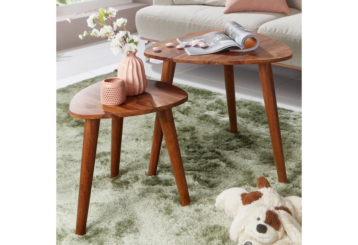 DesignZweiteiliger Satztisch im rustikalen LandhausstilNatürlich gehaltene Tischplatten mit massiven StandbeinenAbmessungen B x H x TGroßer Tisch: 60 x 54 x 60 cmKleiner Tisch: 42,5 x 45 x 42,5 cm Tischplattenstärke: 2 cmFarbe Komplettes Set: Holzfarben (Sheesham)BesonderheitenEmpfohlene max. Belastbarkeit: 30 kgDurch seine unvergleichbare Holzmaserung ist jedes Set ein absolutes UnikatDie Anstelltische können sowohl im Set, als auch getrennt voneinander verwendet werdenJeder Tisch wurde in liebevoller Handarbeit gefertigtHolzschutz bietet die Schutzlackversiegelung der OberflächenMaterialKomplettes Set: Massivholz SheeshamPflegehinweiseDie Oberfläche mit einem lauwarm angefeuchteten Baumwolltuch reinigen. Keine Scheuermittel, scharfen Reinigungsmittel oder tropfnassen Tücher verwenden.LieferumfangEin Tischset ohne DekorationMontageLediglich die Beine müssen angebracht werden