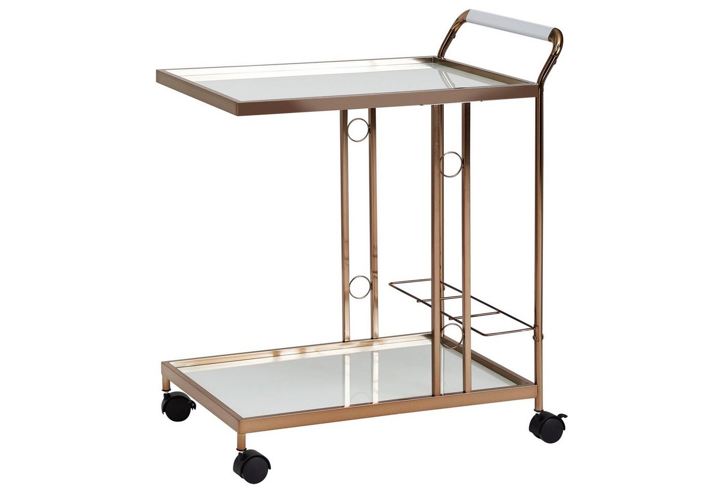DesignModerner Beistelltisch im angesagten GoldtonServierwagen mit einem Hauch von Retro-CharmeEckige Minibar mit zwei AblageflächenAbmessungenBreite: 67 cmHöhe: 80 cmTiefe: 45 cmAbstand zwischen den Ablagen: 58,5 cmAbstellfläche (BxHxT): 57 x 2 x 42 cmDrei Flaschenhalter (BxHxT): 10 x 9 x 14,5 cmBodenfreiheit: 9,5 cmMaximale Belastbarkeit je Glasplatten: 5 kgFarbeWagengestell: Dunkles GoldGlasplatten: WeißBesonderheitenDie Rollen machen aus dem Beistellwagen ein mobiles MöbelstückZwei Feststellbremsen verhindern ein Wegrollen des TischesDie angenehme Höhe ermöglicht ein aufrechtes Schieben des WagensIndividuell einsetzbar als Servierwagen, Minibar oder auch BeistelltischMaterialTischgestell: Lackierter StahlAblagen: Einscheiben-SicherheitsglasLieferumfangEin Servierwagen ohne DekorationMontageIm Lieferumfang enthalten sind eine Montageanleitung sowie MontagematerialEinfacher Aufbau dank gut durchdachter KonstruktionPflegehinweiseDie Oberfläche mit einem lauwarm angefeuchteten Baumwolltuch reinigen. Bitte keine harten Bürsten oder Metallschwämme verwenden, da diese Kratzer im Metall verursachen. Keine Scheuermittel, scharfen Reinigungsmittel oder tropfnassen Tücher verwenden.
