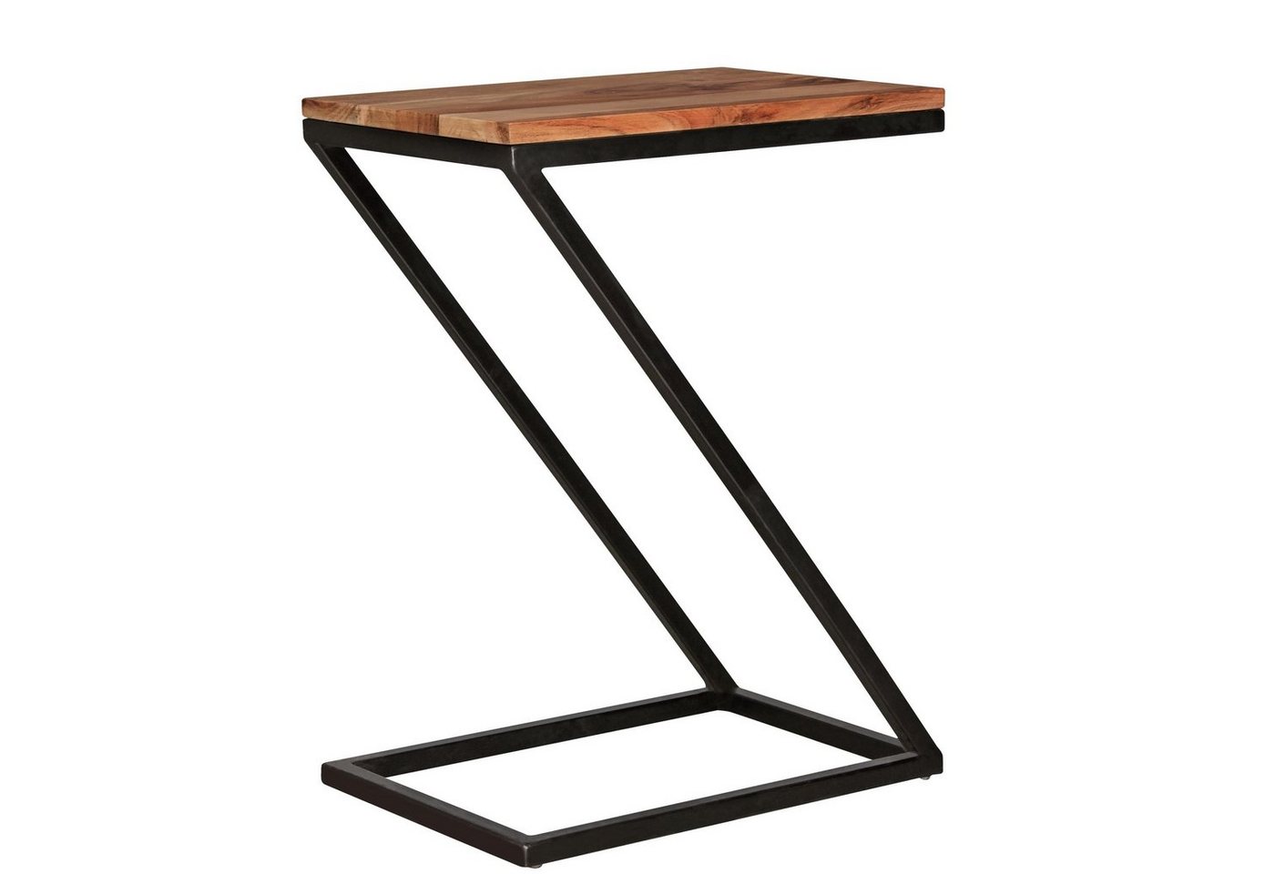 DesignModerner Massivholz Beistelltisch mit MetallgestellAnstelltisch in Form eines ",Z",Natürliche Maserung des EdelholzAbmessungenBreite: 45 cmHöhe: 62 cmTiefe: 32 cmStärke Ablagefläche: 1,5 cmStärke Metallgestell: 2 cmFarbeGestell: SchwarzTischplatte: SheeshamBesonderheitenDie Schutzlackbeschichtung auf der Oberfläche trägt zur Langlebigkeit beiHohe Stabilität dank des robusten Gestells aus MetallDa es sich um ein Naturprodukt handelt ist jeder Tisch ein UnikatJeder Holztisch wurde liebevoll von Hand gefertigtMaterialAblage: Sheesham massivGestell: Pulverbeschichtetes MetallLieferumfang1 Beistelltisch ohne DekorationMontageLieferzustand: MontiertPflegehinweiseMit feuchtem Tuch, evtl. mit mildem Reinigungsmittel, abwischen mit trockenem Tuch nachwischen – keine scharfen oder lösungsmittelhaltigen Reiniger verwenden.