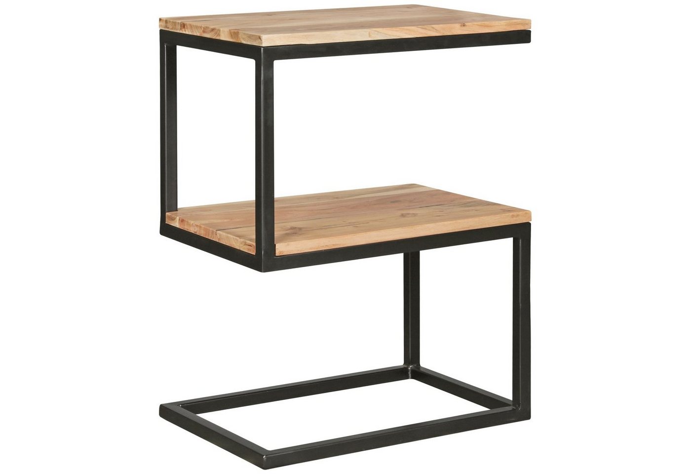 DesignAnstelltisch in Form eines ",S",Moderner Beistelltisch mit MetallgestellNatürliche Maserung des EdelholzesZwei Ablageflächen bieten viel PlatzAbmessungenBreite: 45 cmHöhe: 60 cmTiefe: 30 cmAbstand zwischen den Ablagen: 26 cmMaximalbelastbarkeit pro Platte: 40 kgFarbeTischplatte: AkazienfarbenGestell: Matt schwarzBesonderheitenHolzschutz bietet die Schutzlackversiegelung der OberflächenDie Tische wurden in liebevoller Handarbeit gefertigtDie individuelle Maserung des Holzes macht jedes Teil zu einem UnikatMaterialAblagen: Akazie MassivholzTischgestell: Pulverbeschichtetes MetallLieferumfangEin Beistelltisch ohne DekorationMontageLieferzustand: Montiert, kein Aufbau nötigPflegehinweiseDie Oberfläche mit einem lauwarmen angefeuchtetem Baumwolltuch reinigen – kein Scheuermittel, scharfe Reinigungsmittel oder tropfnasse Tücher verwenden. Keine weitere Behandlung der naturbelassenen Oberfläche (ölen oder wachsen) notwendig.